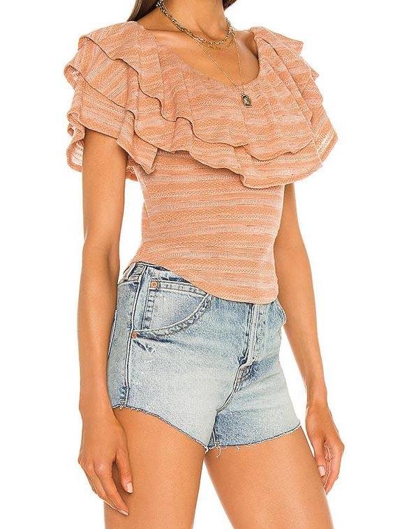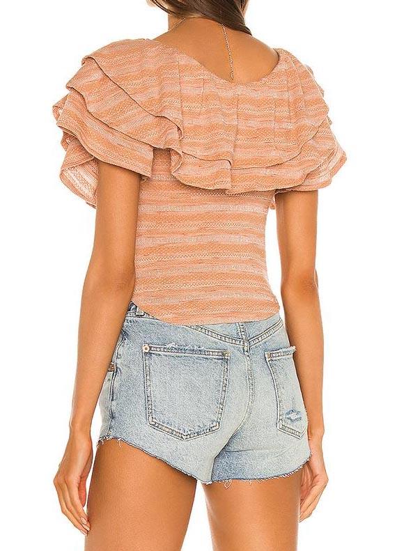 Sassy and sweet, this blouse is fashioned with frills and ruffles for added elegance and pretty puff sleeves to help accent the arms. A smocked fabric back fits and flatters the curves. And it can perfectly mix and match your favorite denim shorts.- Occasion: Daily