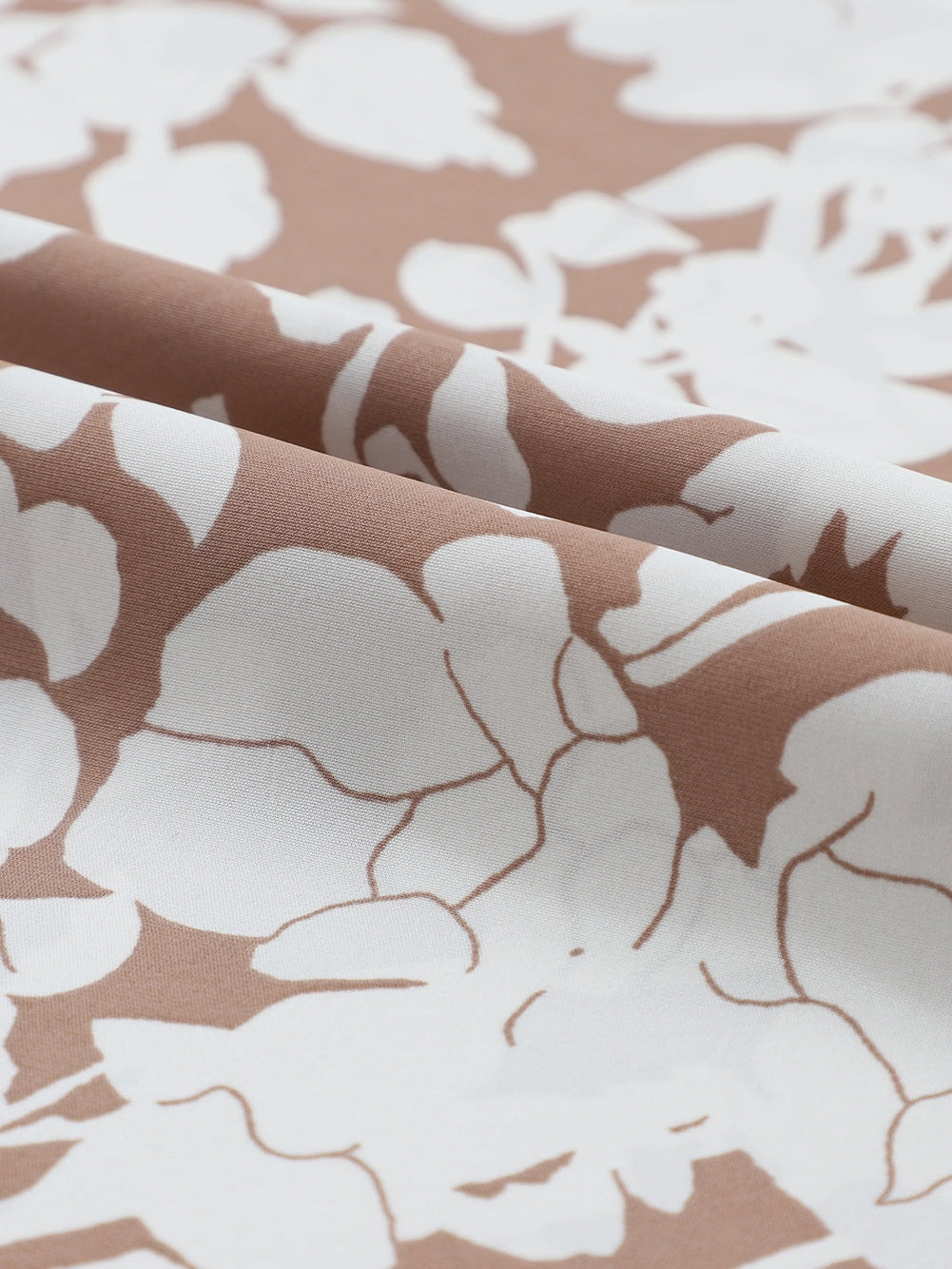 French Beige Floral Print Ruffle Neckline Flounce Sleeve Top