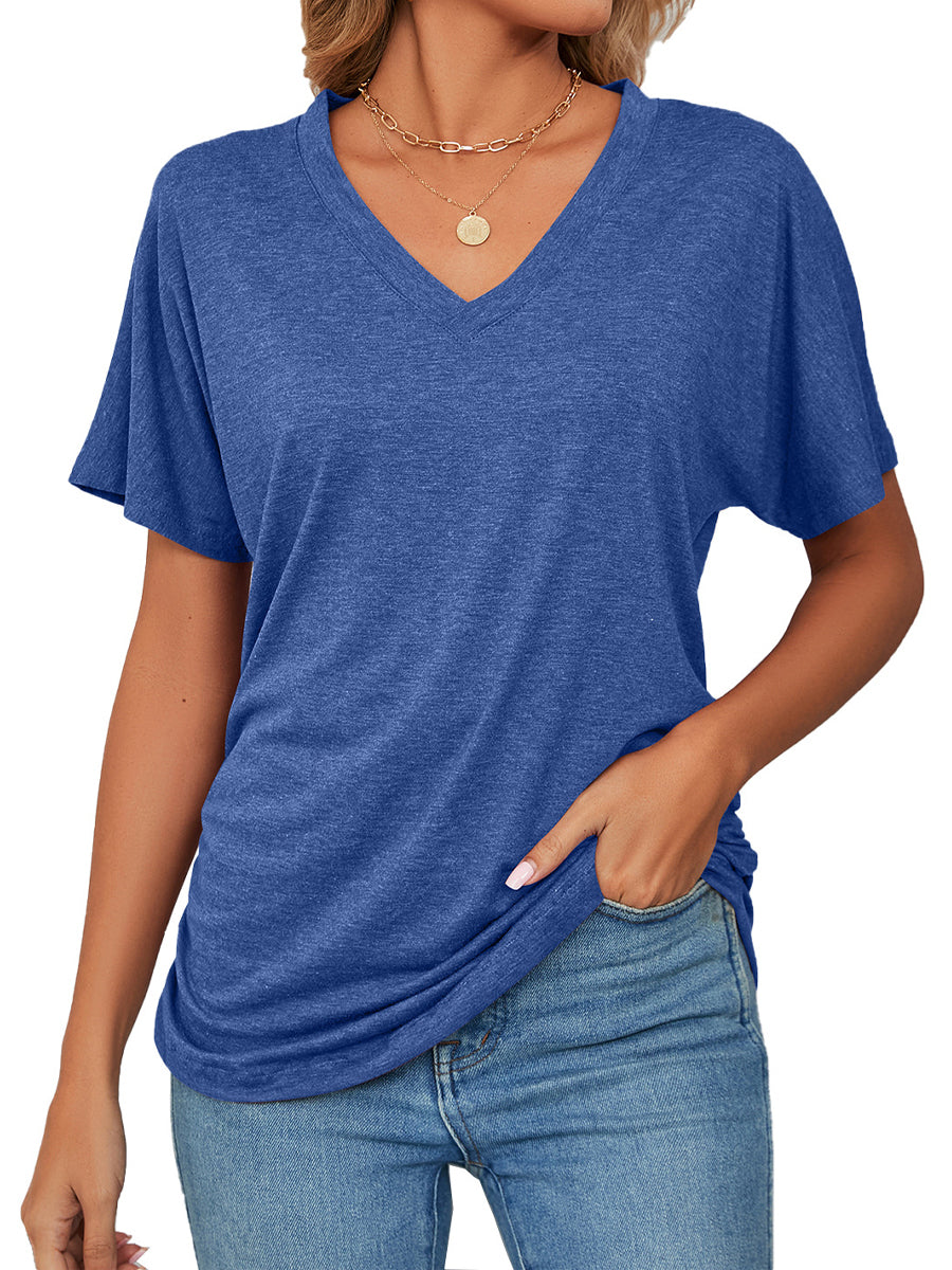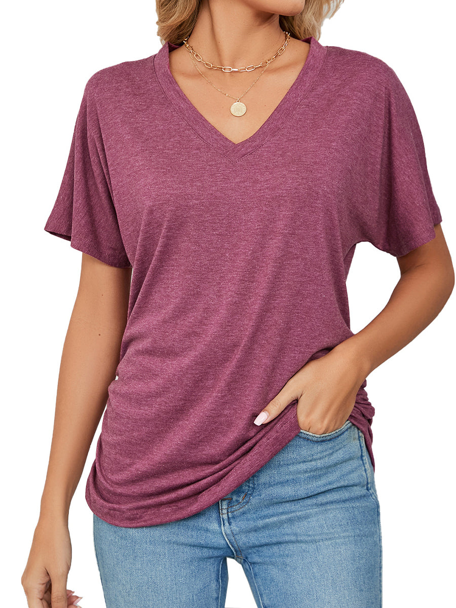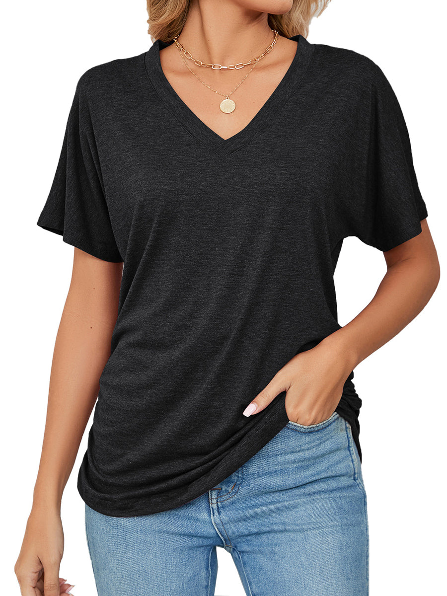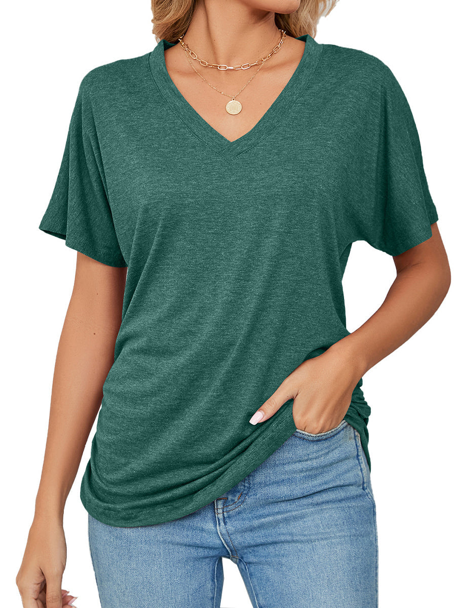 Casual V Neck Short Sleeve Solid Color Basic T-Shirt