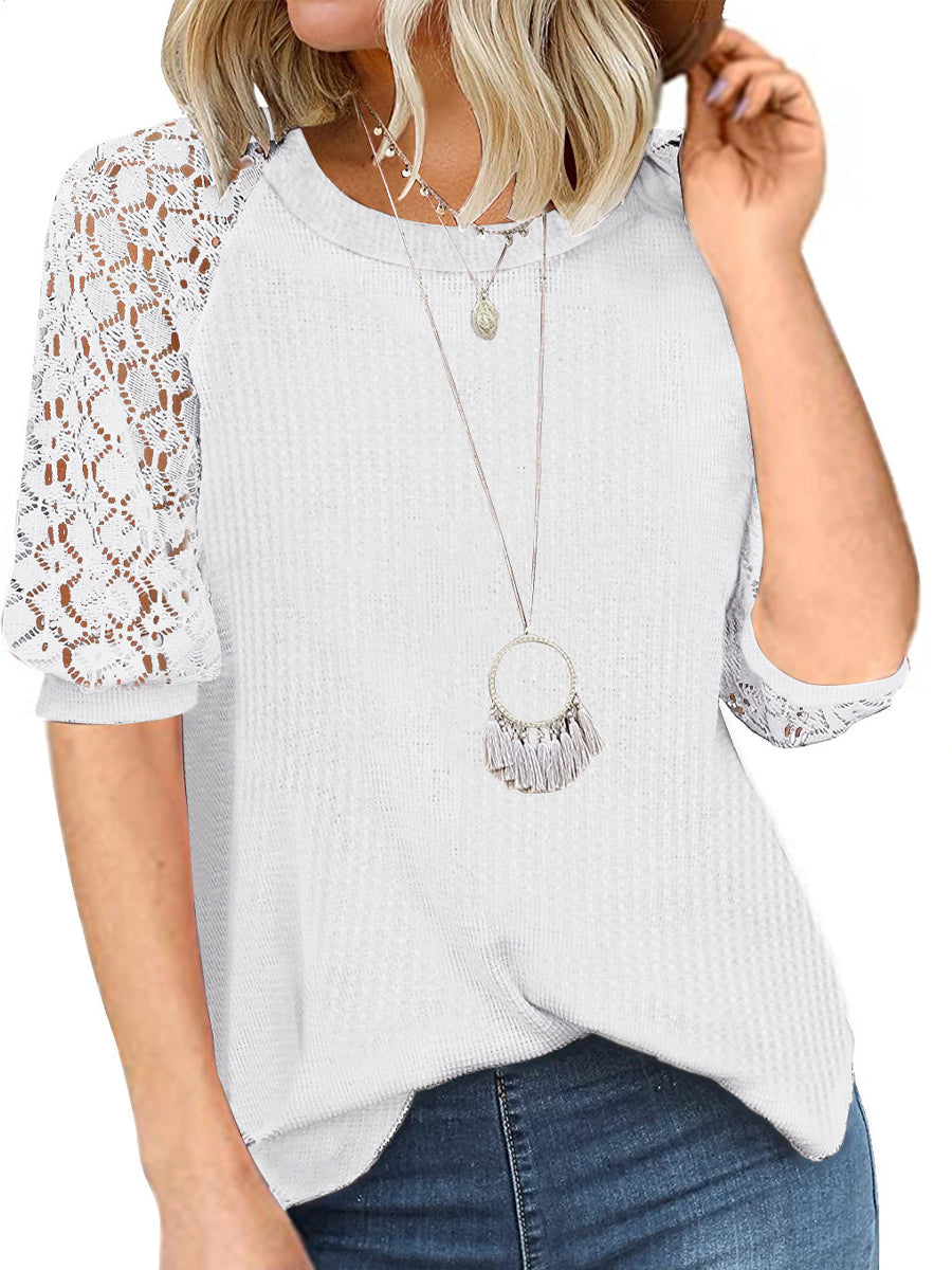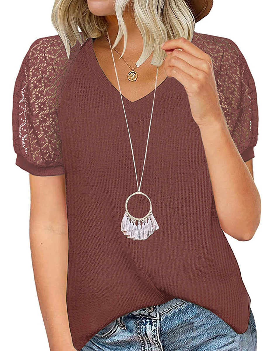 Lace Loose Casual Waffle Tee Short Sleeve V Neck T-Shirt