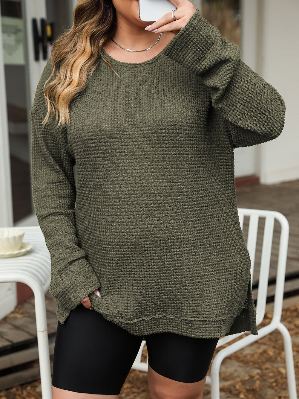 Textured Moss Green Plus Size Waffle Knit Top with Long Sleeves