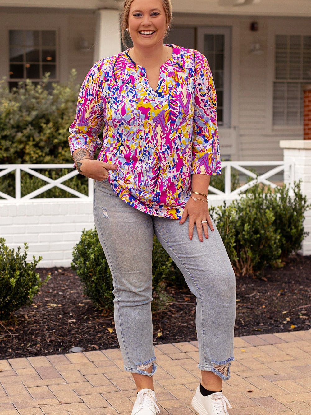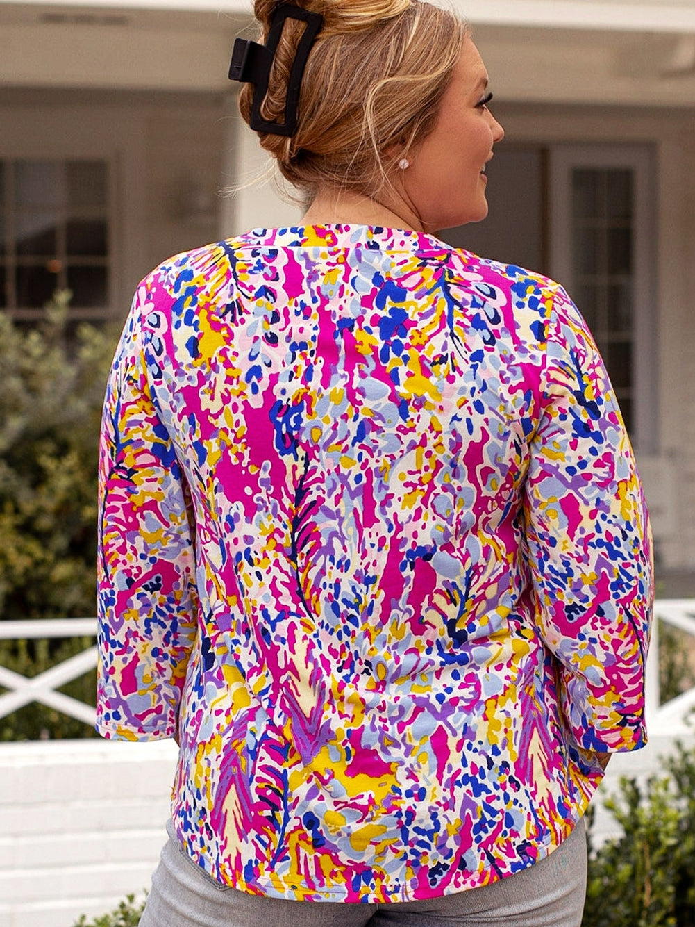Multicolor Printed 3/4 Sleeve Split Neck Plus Size Tunic Top