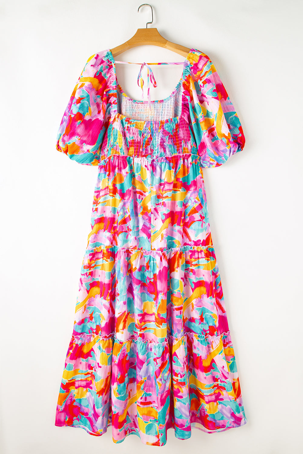 Multicolour Plus Size Floral Smocked Puff Sleeve Maxi Dress