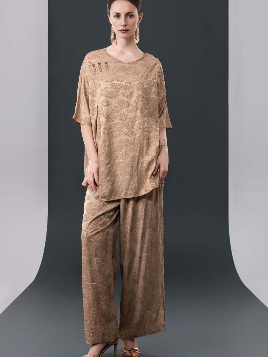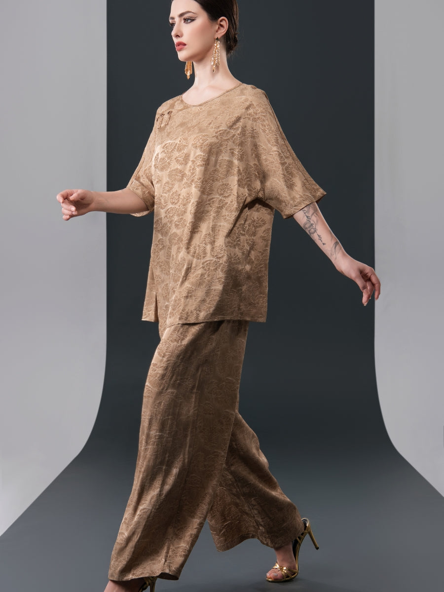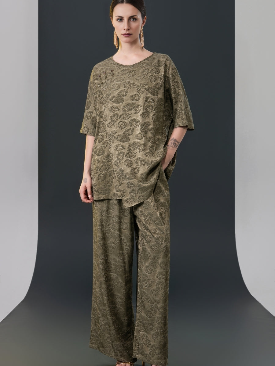 Achieve effortless style with this olive green floral two-piece set. Featuring a relaxed-fit top and matching wide-leg pants, this ensemble combines comfort with sophistication. The intricate floral pattern adds a touch of elegance, making it perfect for both casual outings and semi-formal events. Pair with statement earrings and heels for a chic, coordinated look.