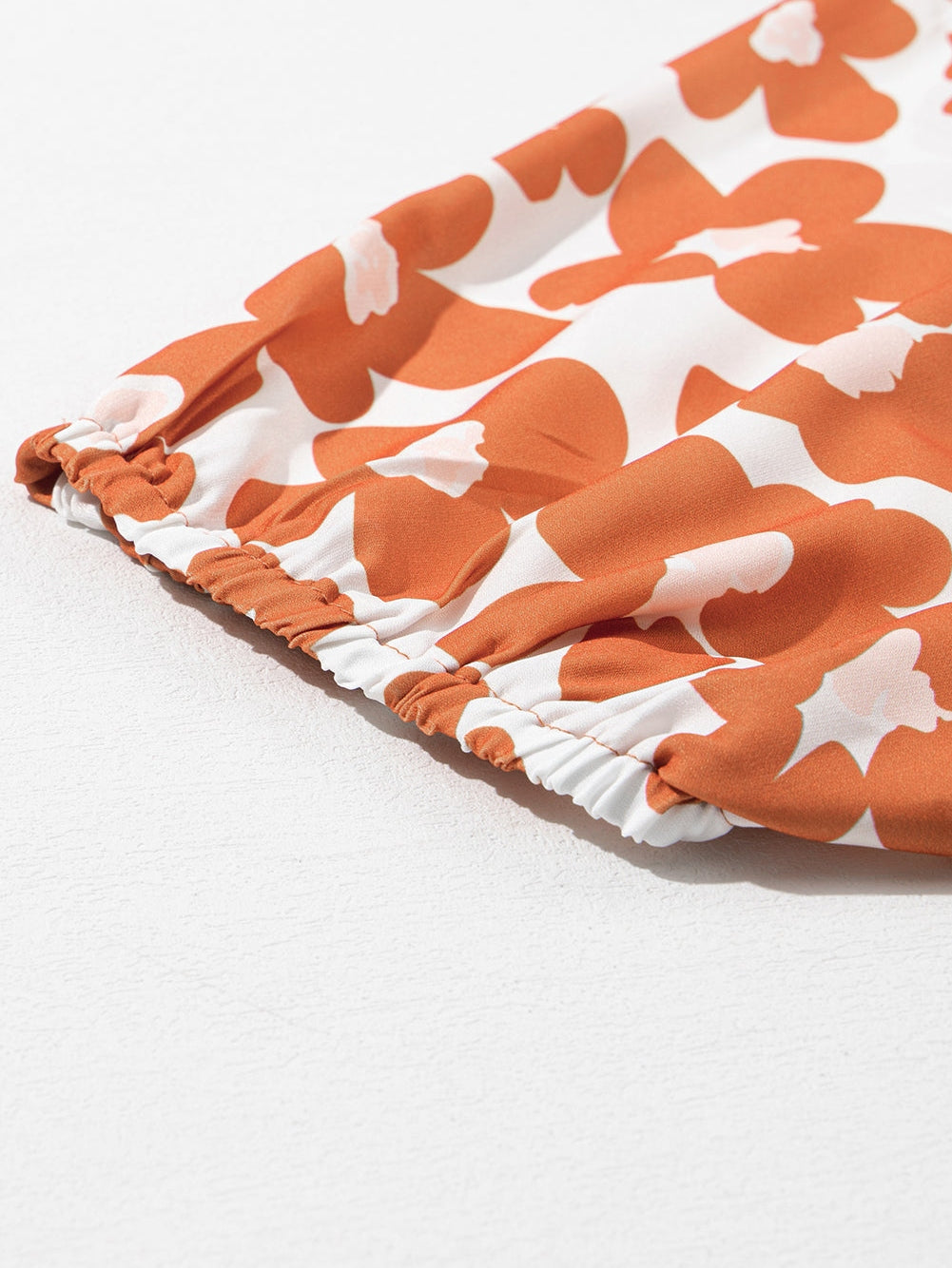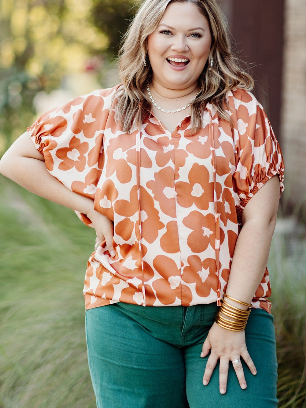 Orange Floral Print Plus Size V Neck Short Sleeve Blouse with Drawstring