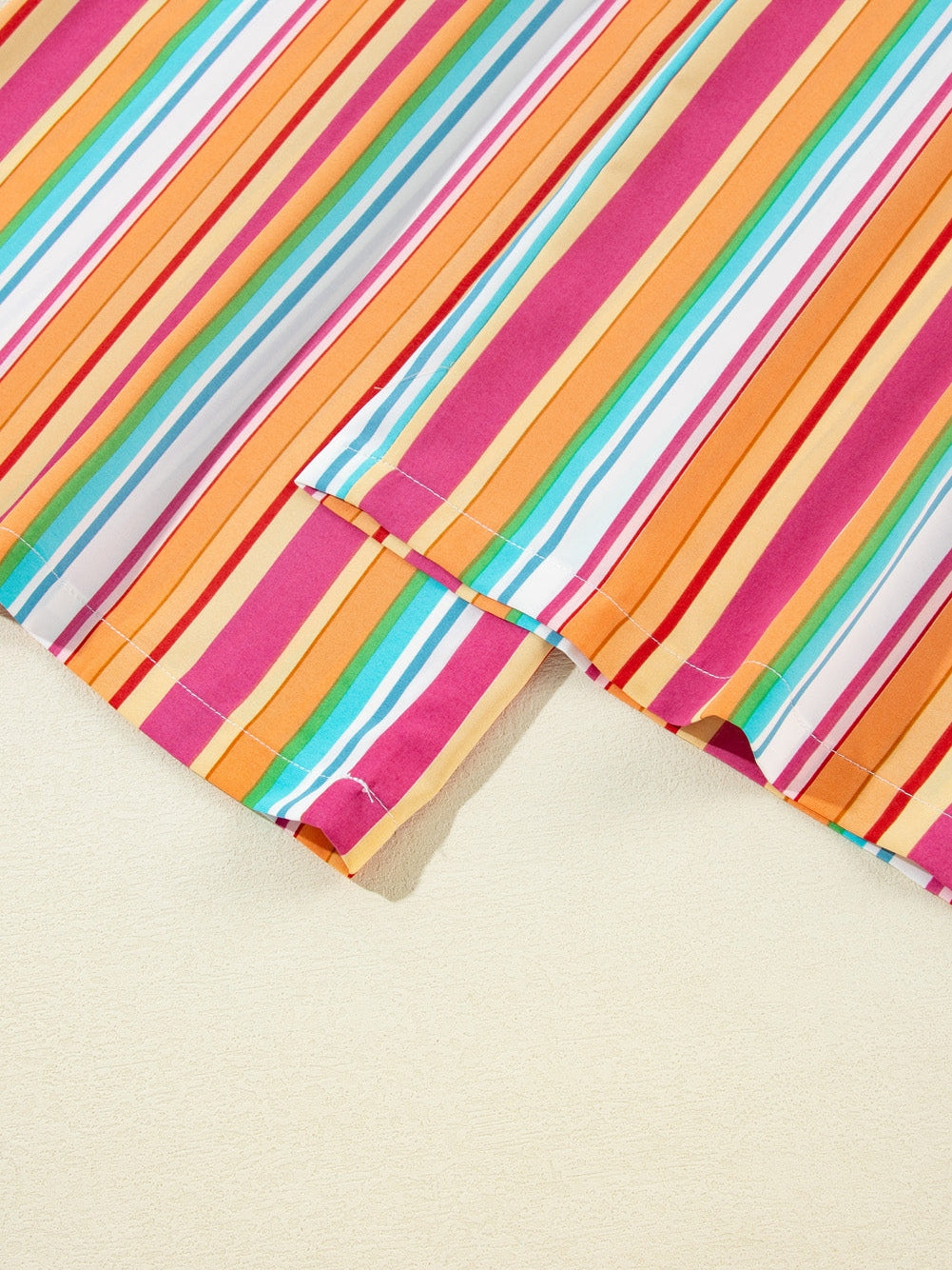 The vibrant vertical stripes add a pop of color and personality, making you stand out from the crowd. The smocked waistband not only enhances the overall style but also ensures a comfortable and flexible fit throughout the day.