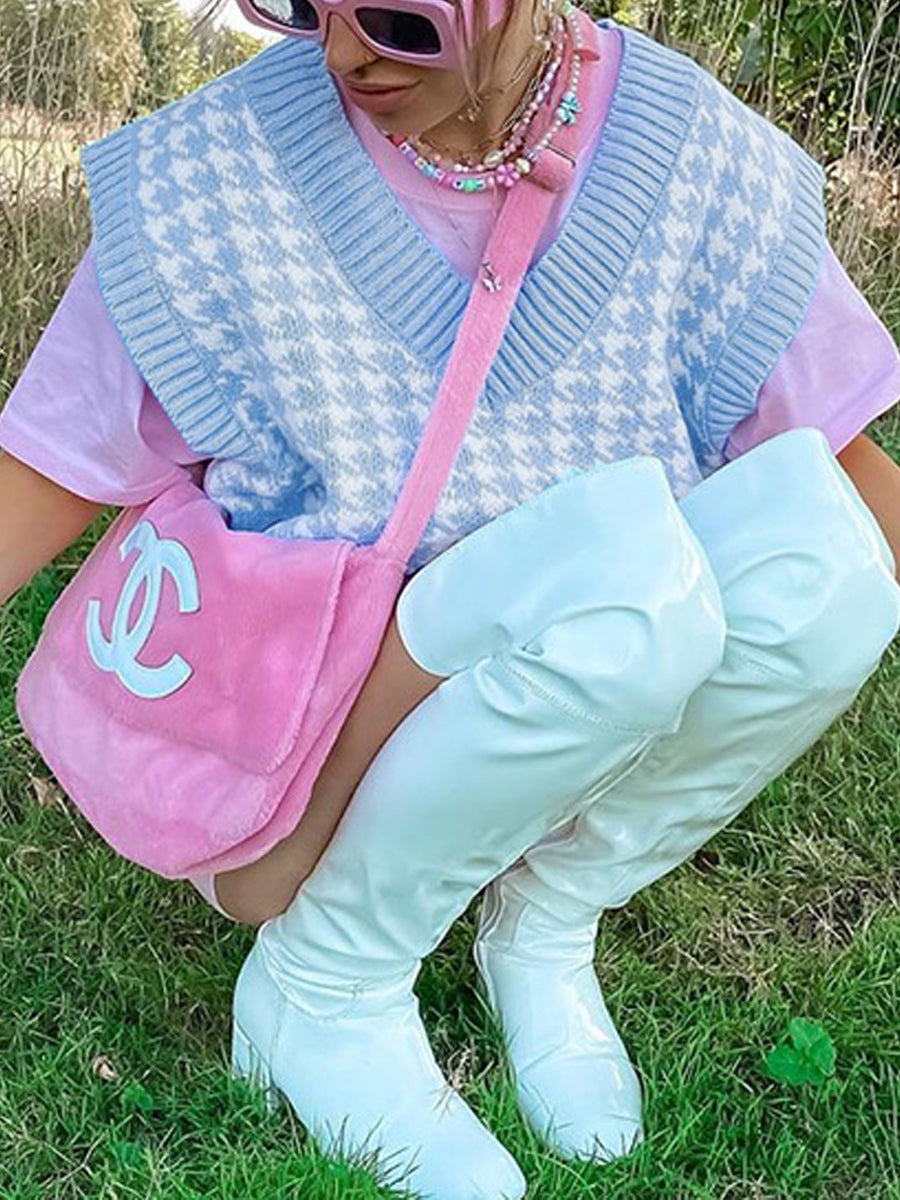 Round Neck Vest Sleeveless Houndstooth Plaid Knitted Sweater