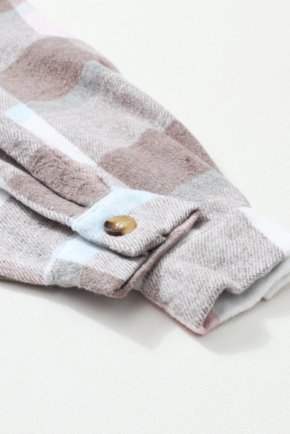 Elevate your autumn wardrobe with our Pale Khaki Plaid Big Flap Pocket Amber Button Shacket. This exquisite piece combines style and functionality, making it a must-have for the season.