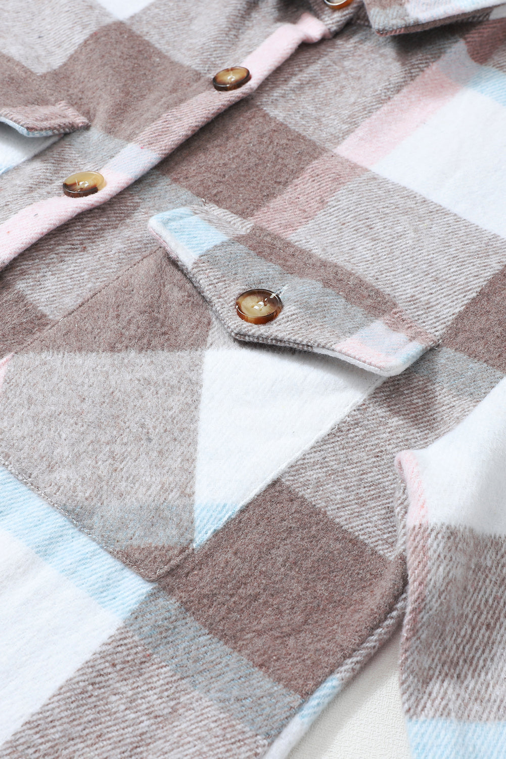 Transform your everyday look with this chic and functional shacket, perfect for layering as the temperatures drop. Embrace the fall season in style with our Pale Khaki Plaid Big Flap Pocket Amber Button Shacket!