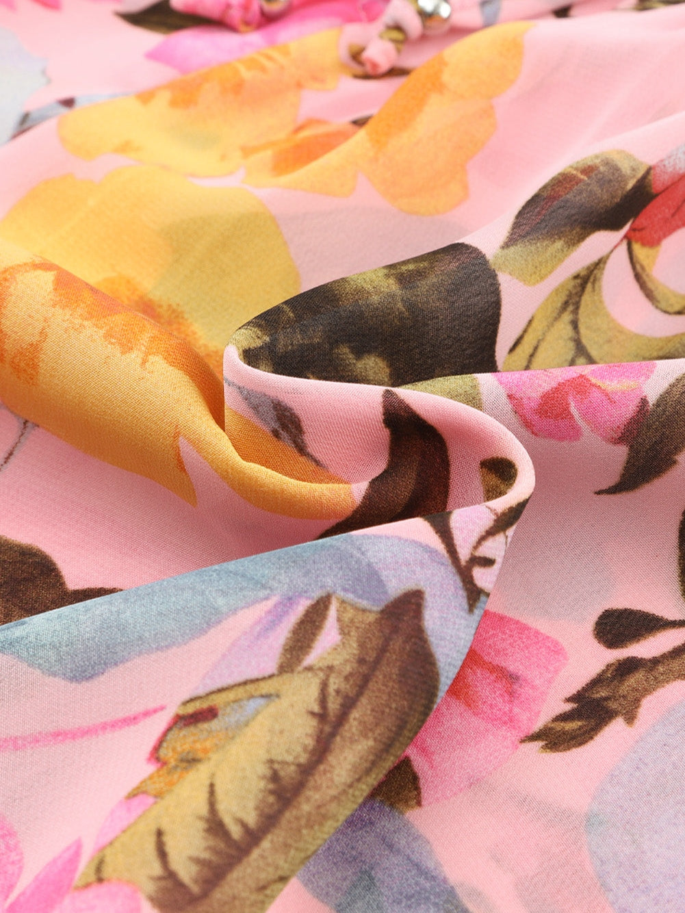 Pink Floral Print Tiered Ruffled Long Sleeve Blouse