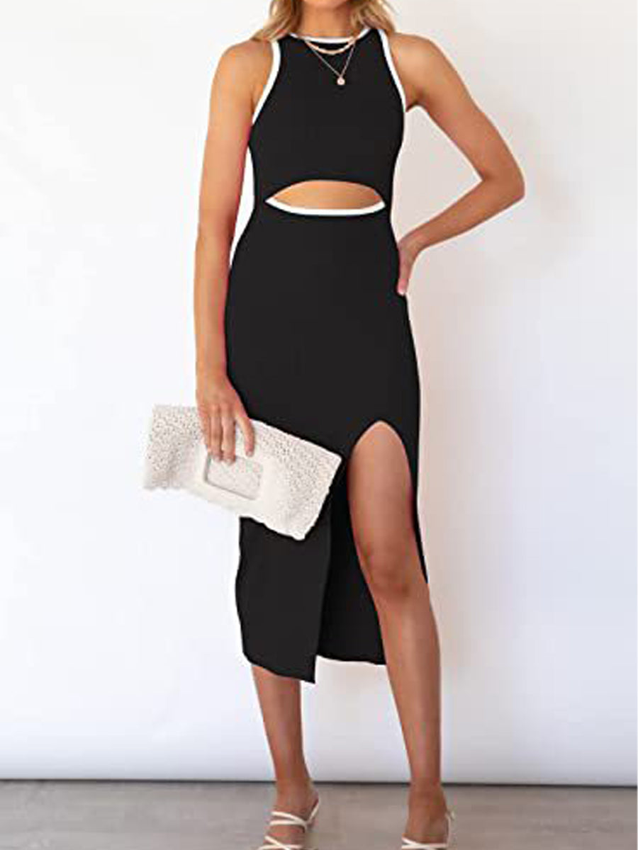 Cutout Crew Neck Sleeveless Slit Ribbed Bodycon Midi Dress