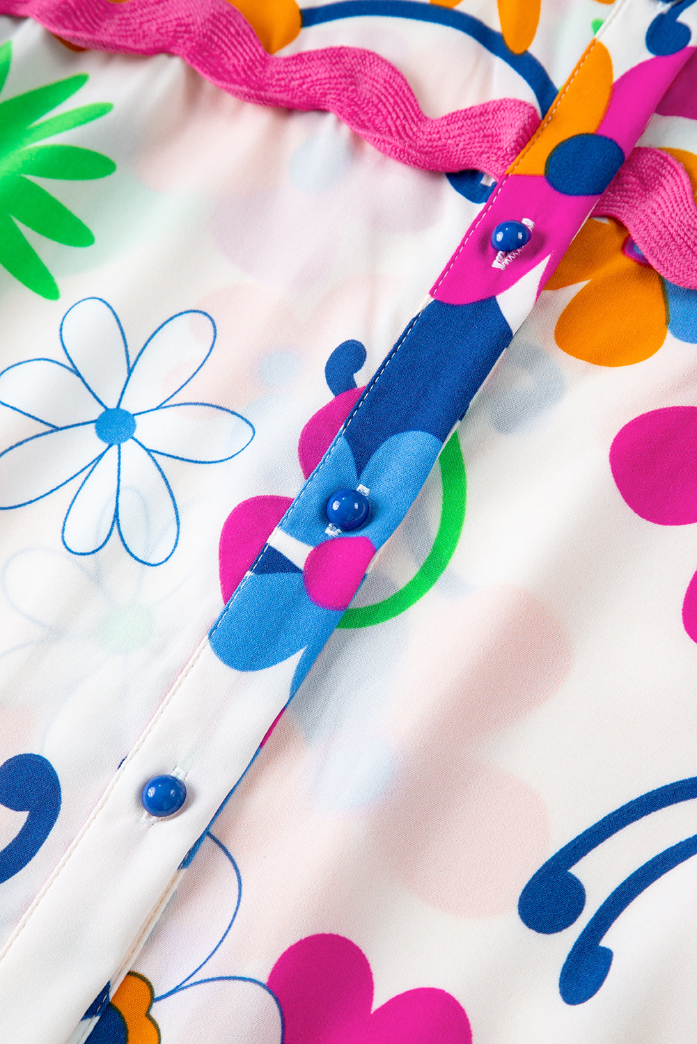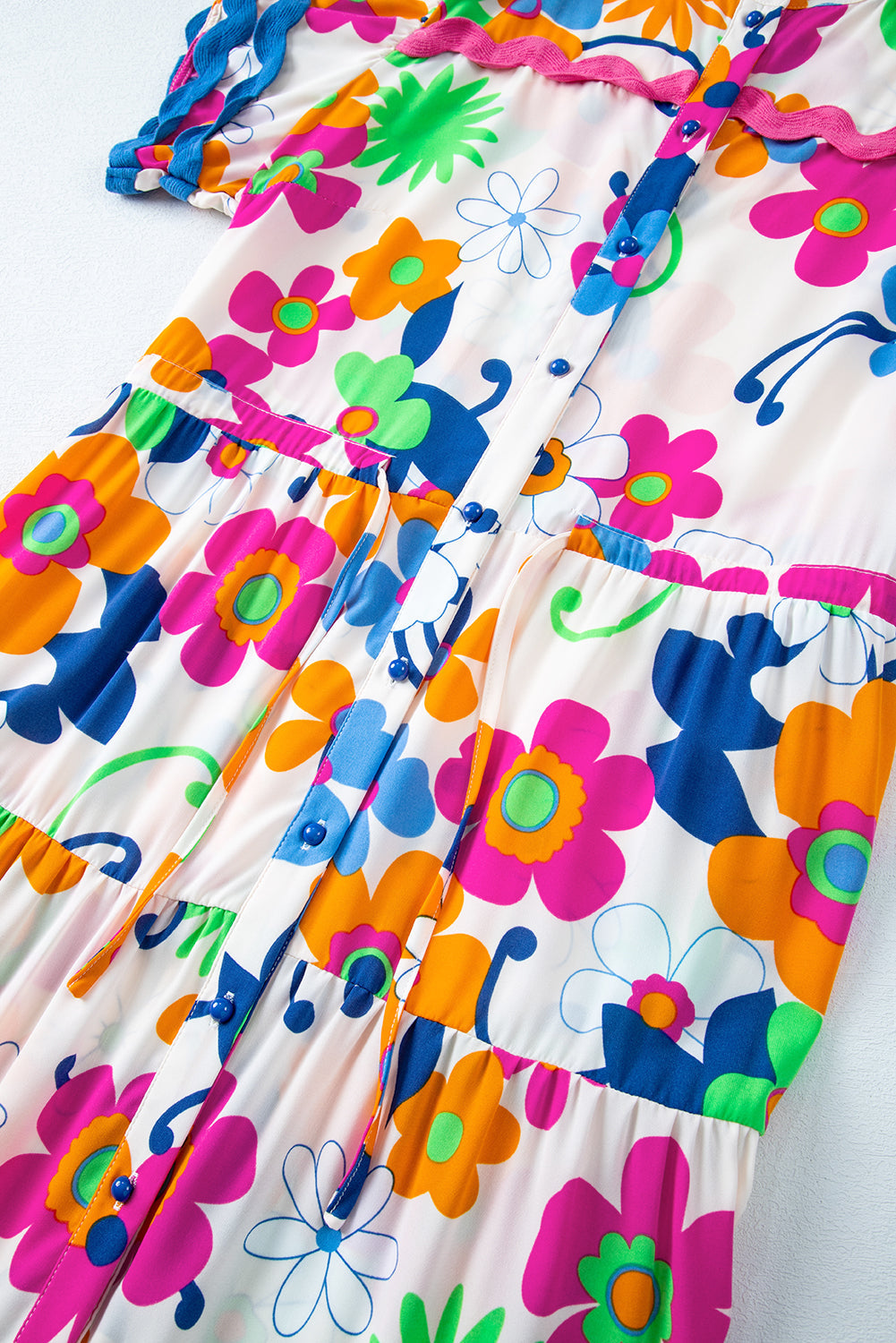 Pink Ricrac Trim Flutter Sleeve Buttoned Floral Maxi Dress