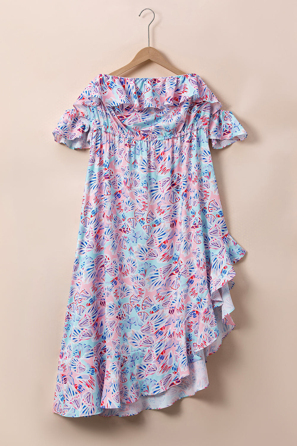 Pink Sea Shell Print Ruffled Sleeve Plus Size Maxi Dress