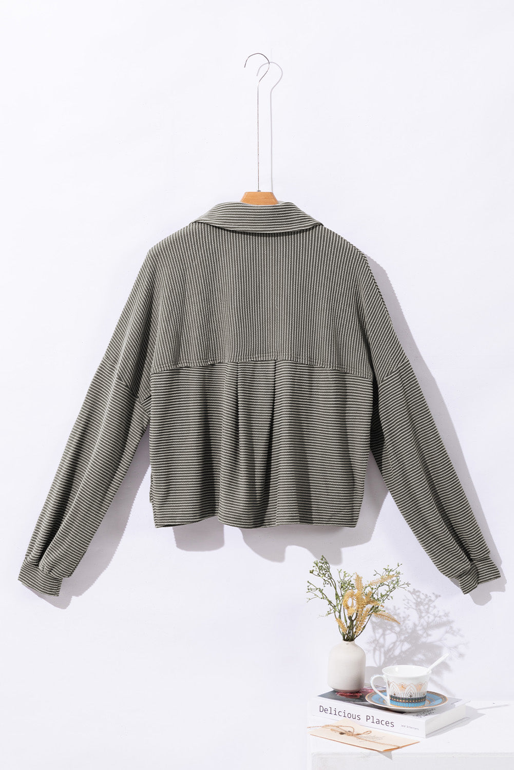 Upgrade your outerwear collection with the Real Teal Boxy Fit Flap Pockets Pinstriped Shacket. This stylish piece is not only functional but also a statement of elegance. Perfect for layering or wearing solo, it is a must-have for the chic, modern woman.