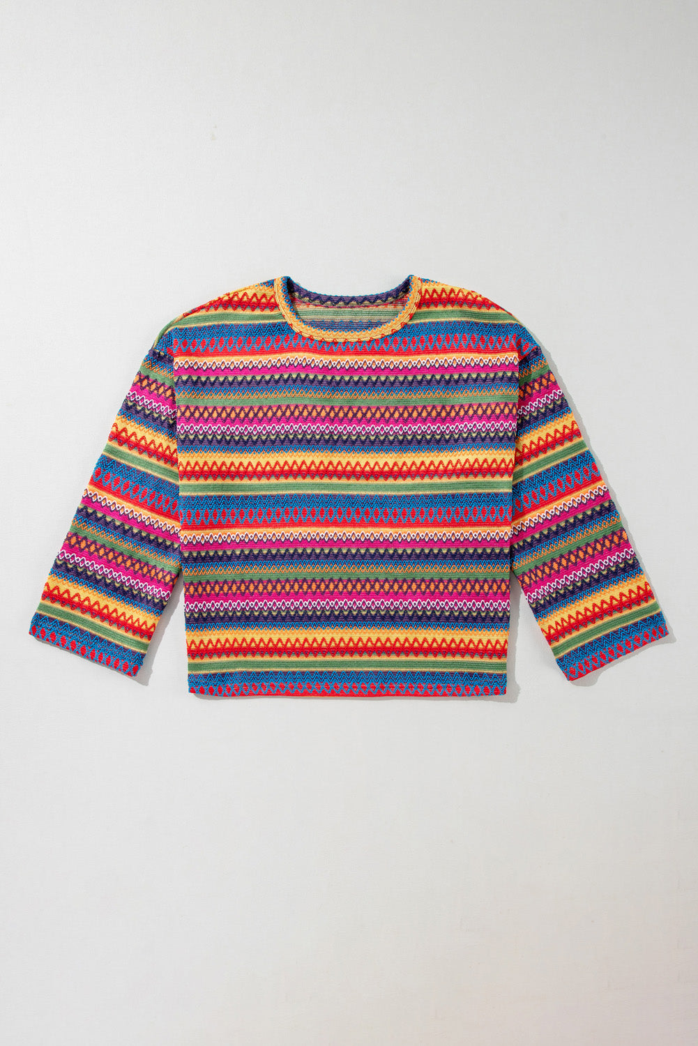 Embrace comfort and style with our Red Ethnic Striped Print Long Sleeve Plus Size Top. Perfect for those who appreciate a blend of bohemian flair and modern design, this top is a must-have addition to your wardrobe.