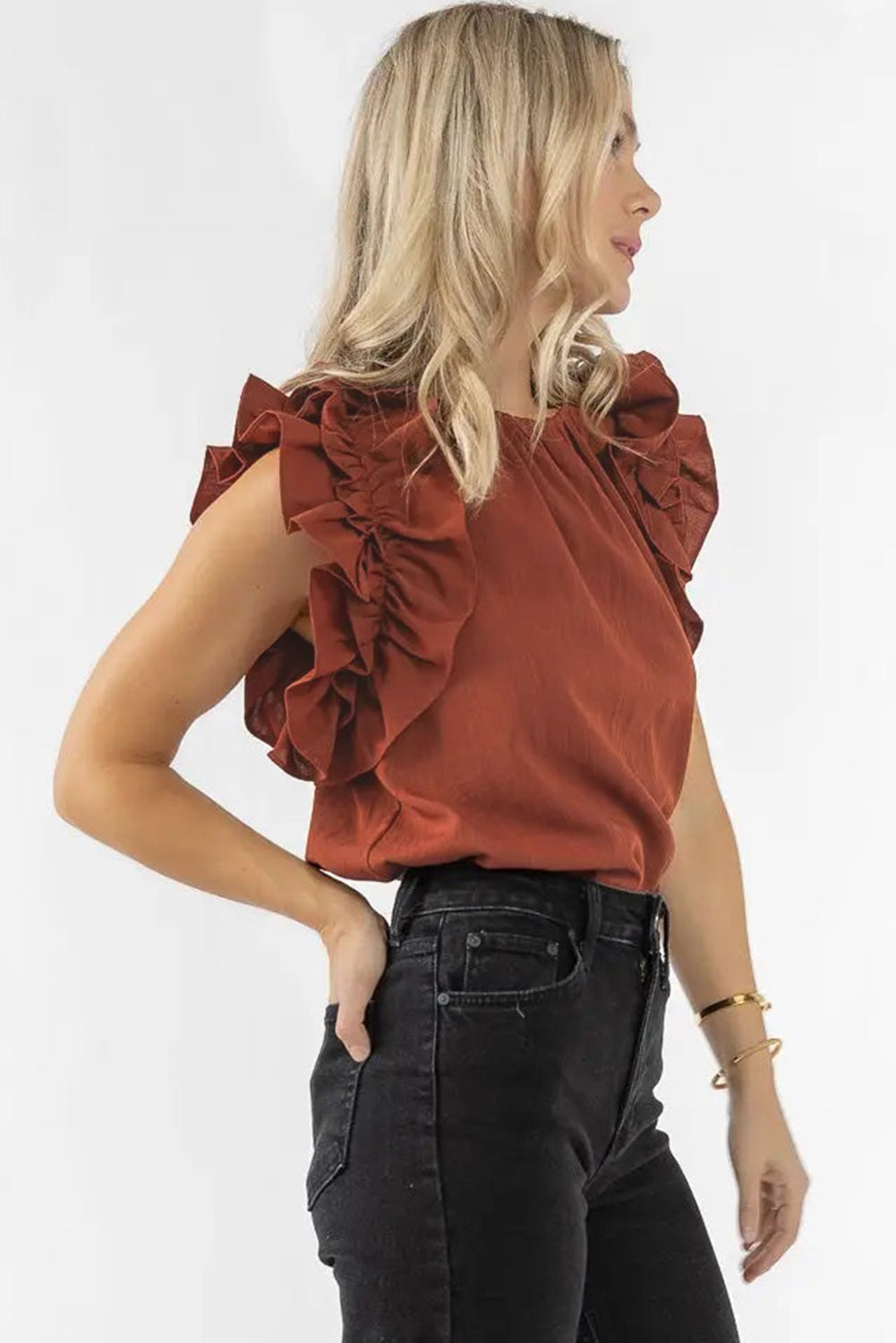 Don't miss out on the chance to enhance your fashion game with this elegant piece. Add the Red Sandalwood Ruffle Trim Sleeveless Blouse to your collection today!