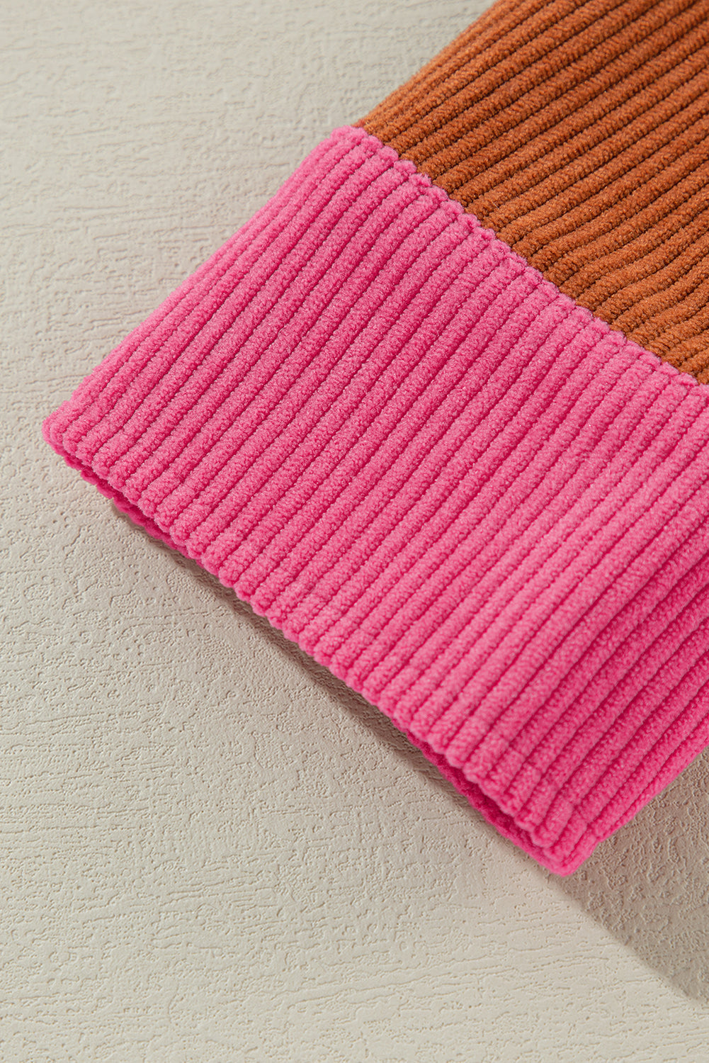 Elevate your wardrobe today with the Rose Red Colorblock Curved Hem Corduroy Shacket. A staple piece that combines practicality with undeniable style!