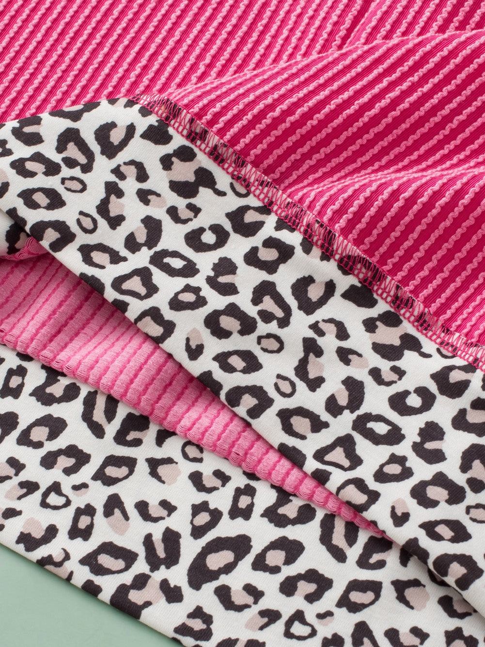 Rose Red Leopard Trim V Neck Short Sleeve Plus Size Corded Top