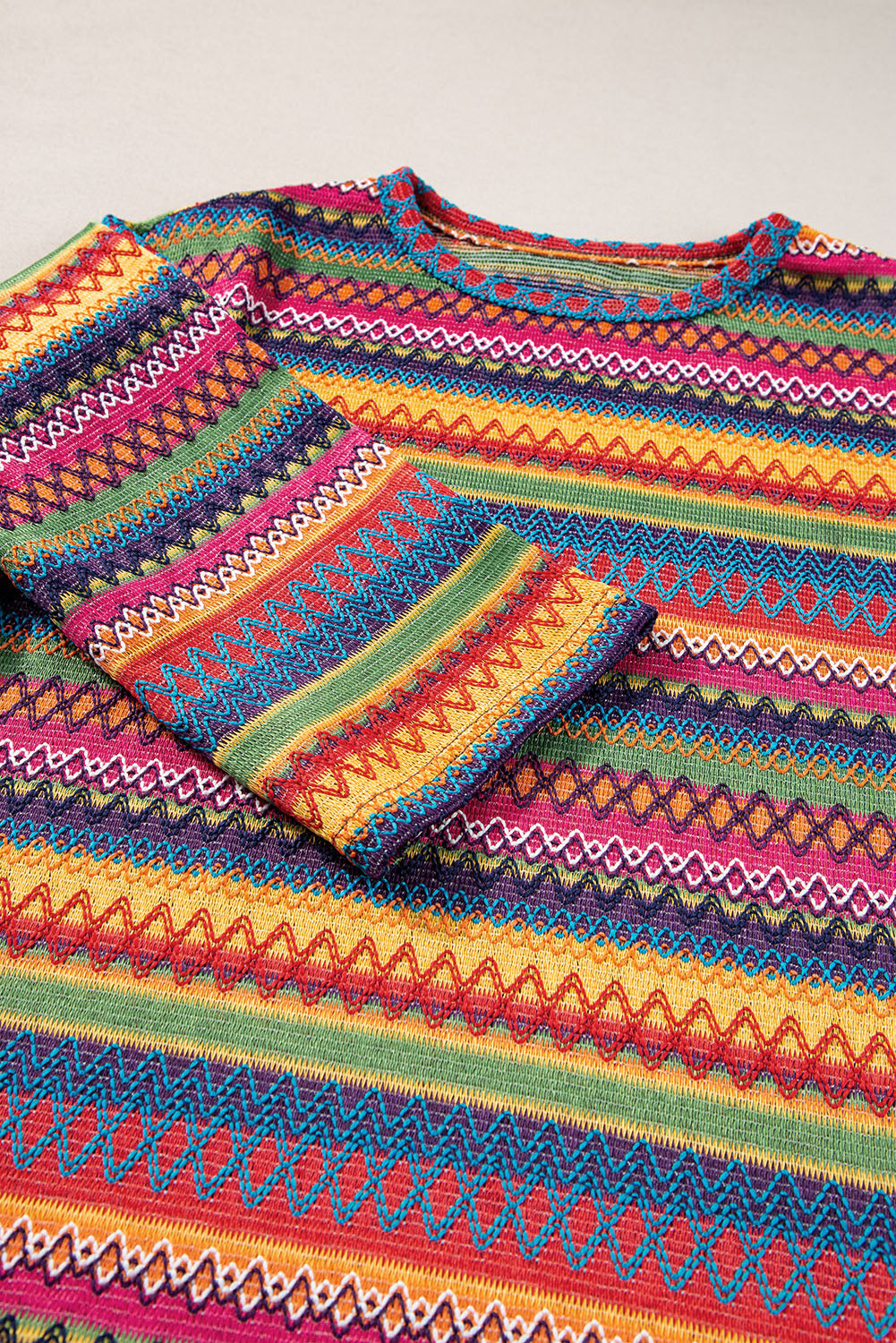 Don't miss out on this hot pick for the season. Add the Rose Red Multicolor Jacquard Geo Long Sleeve T-Shirt to your cart today and redefine your style!