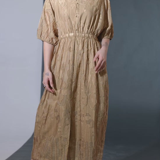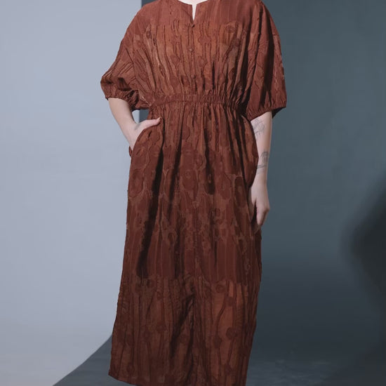 Elevate your style with this rust textured midi dress, featuring a cinched waist for a flattering silhouette. The intricate textured pattern and rich rust color add a touch of sophistication, while the relaxed fit and soft fabric ensure all-day comfort. Perfect for both casual and semi-formal occasions, pair this dress with statement jewelry and heels for a complete, stylish look.