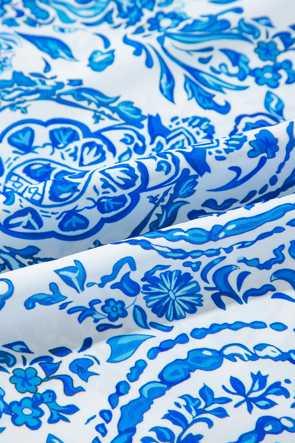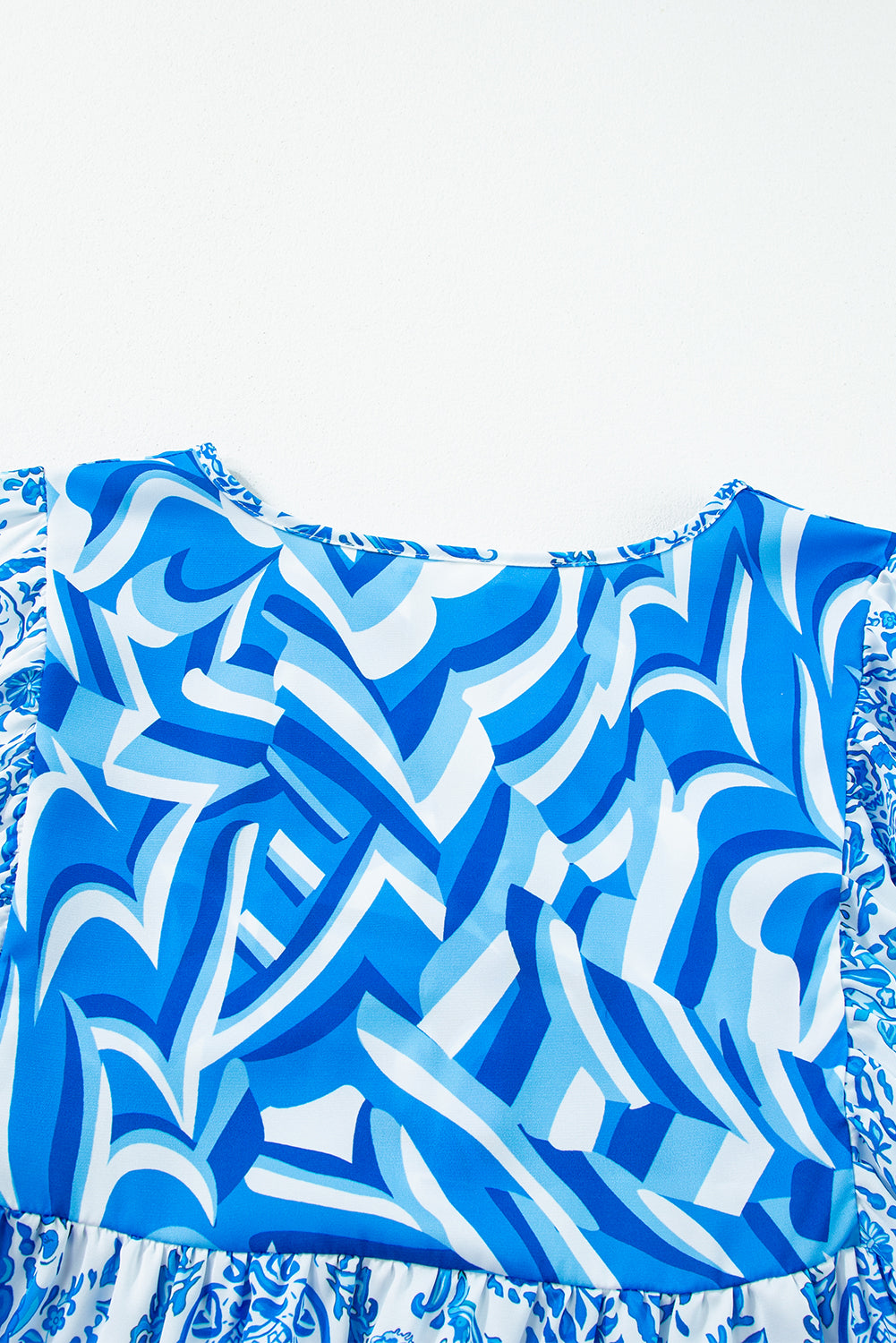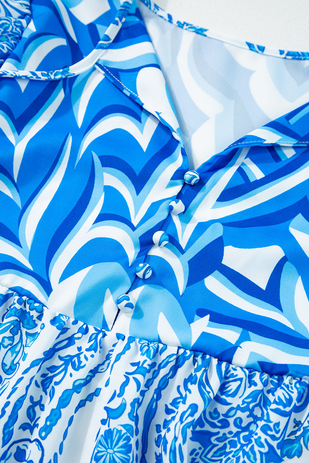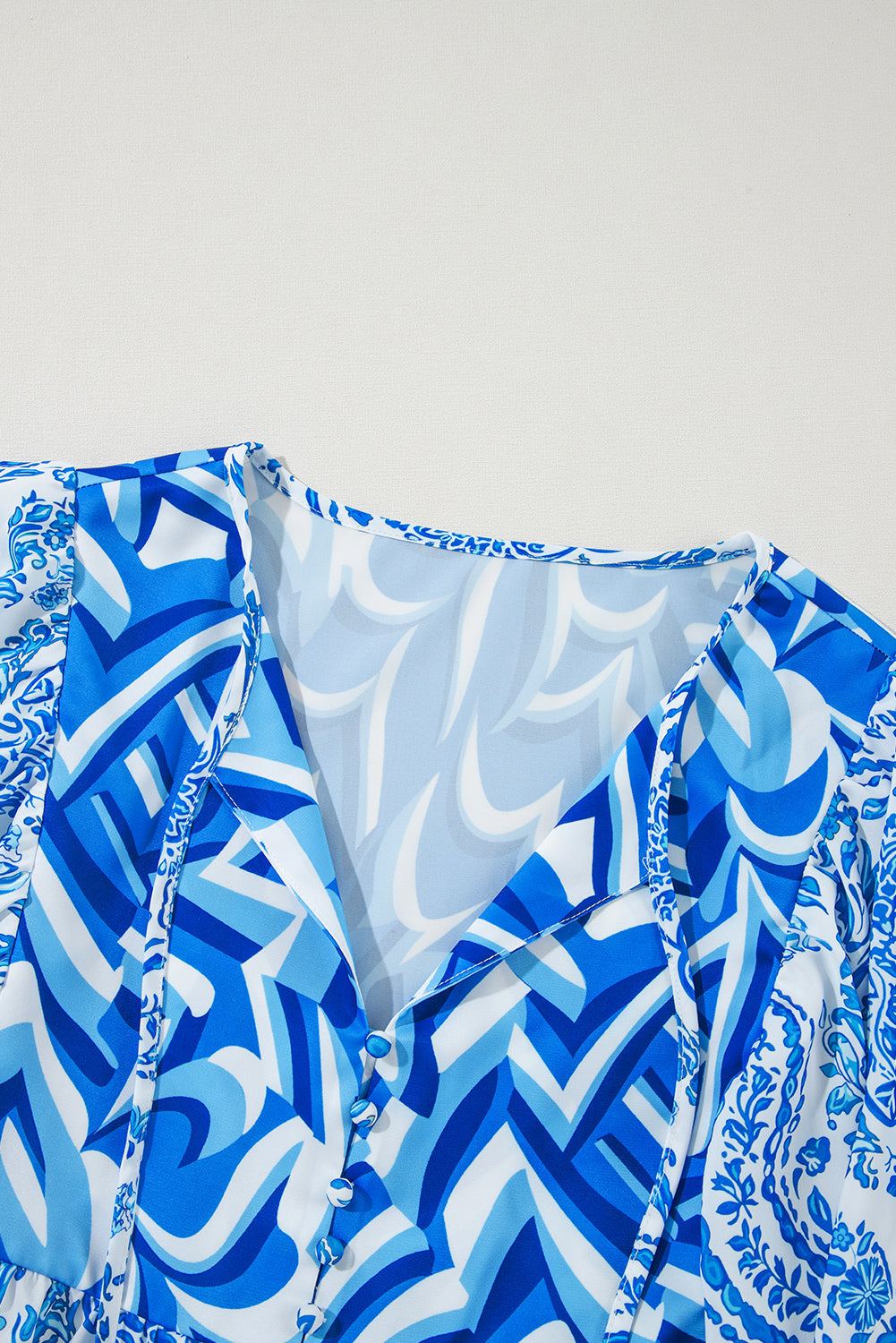 Sky Blue Bohemian Print Puff Sleeve Tied V Neck Flared Mini Dress