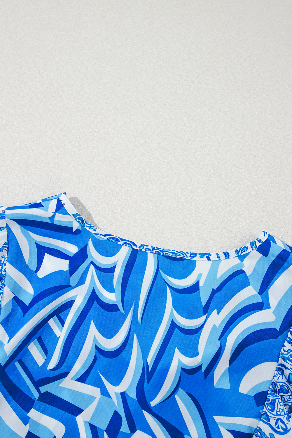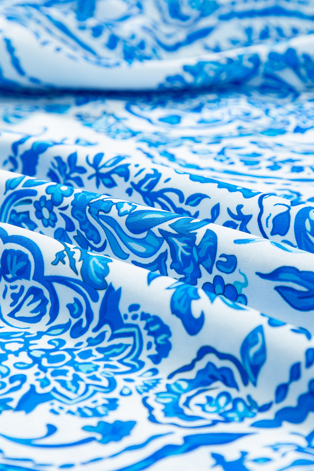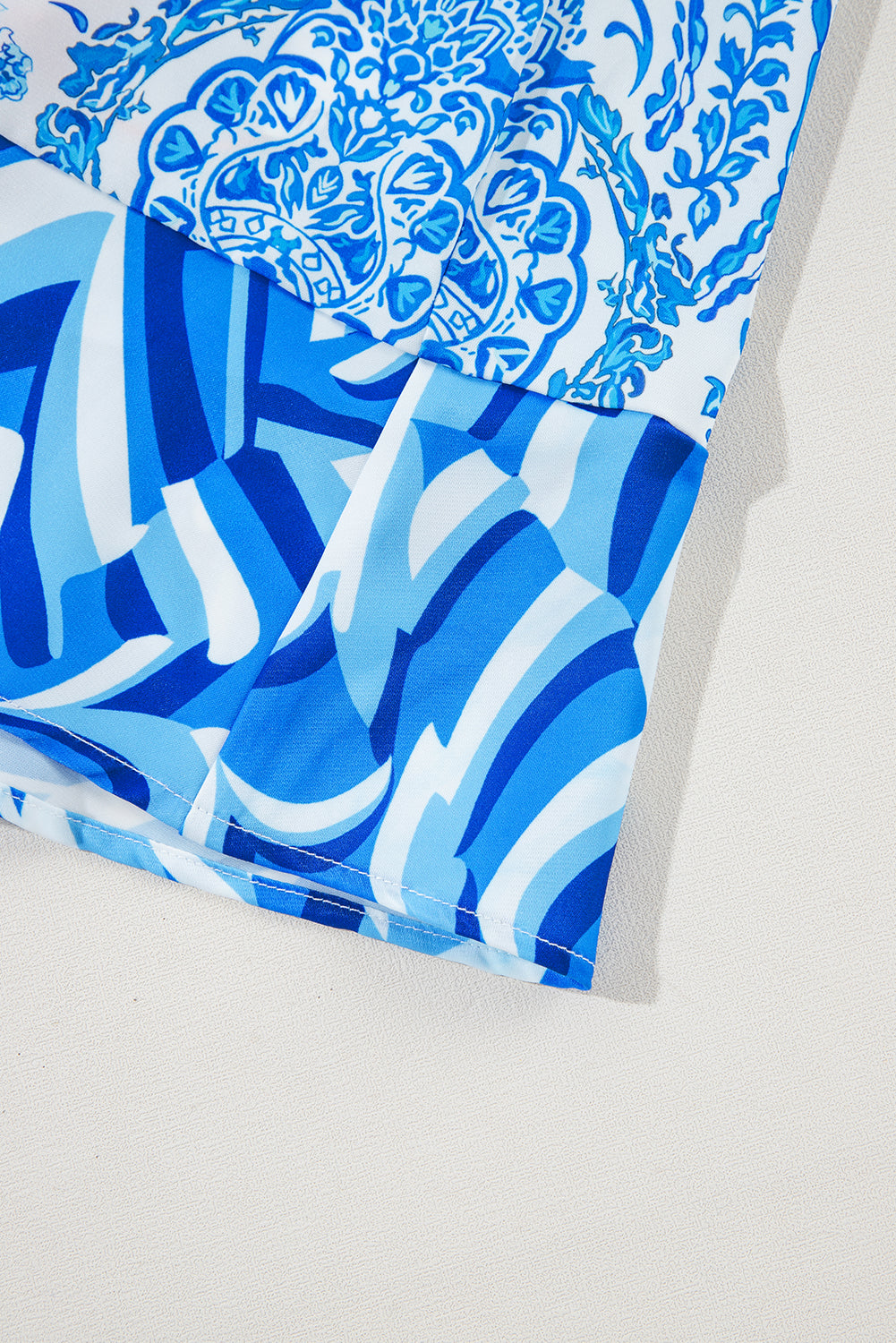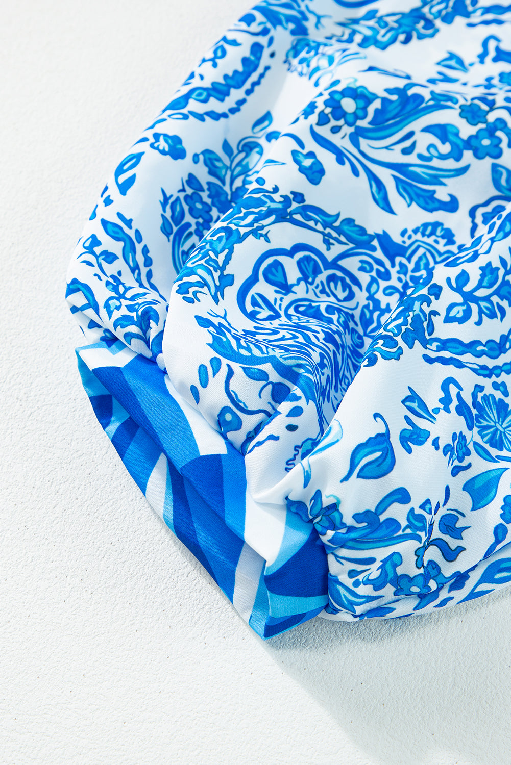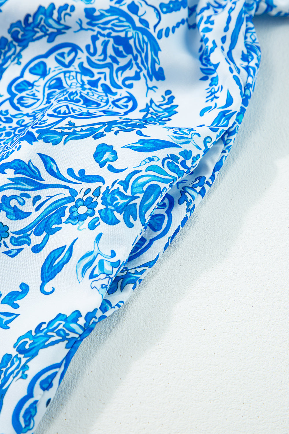 Sky Blue Bohemian Print Puff Sleeve Tied V Neck Flared Mini Dress