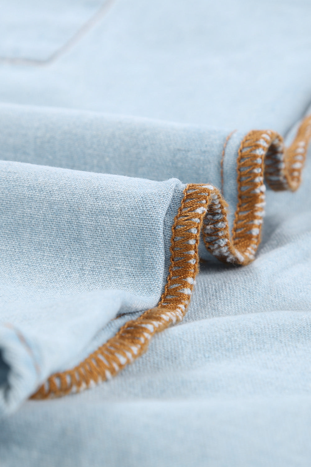 - Distinctive Design: The light wash denim is complemented by striking contrast leopard sleeves, adding a playful yet chic element to your outfit.