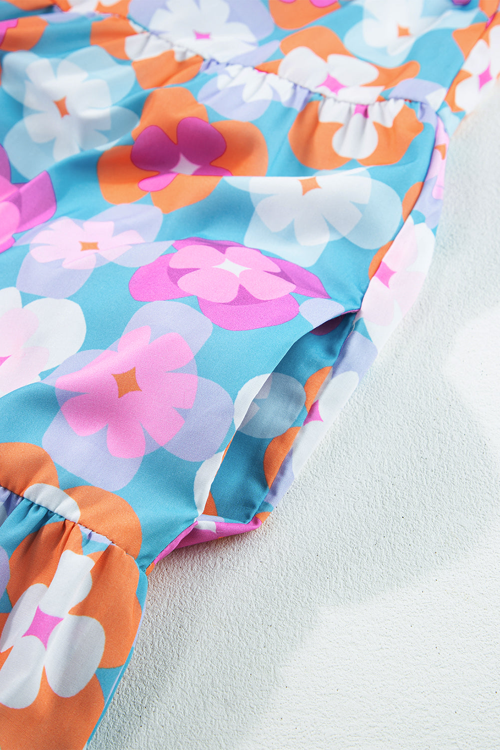 Sky Blue Floral Print Frilly Neck Sleeveless Tiered Maxi Dress