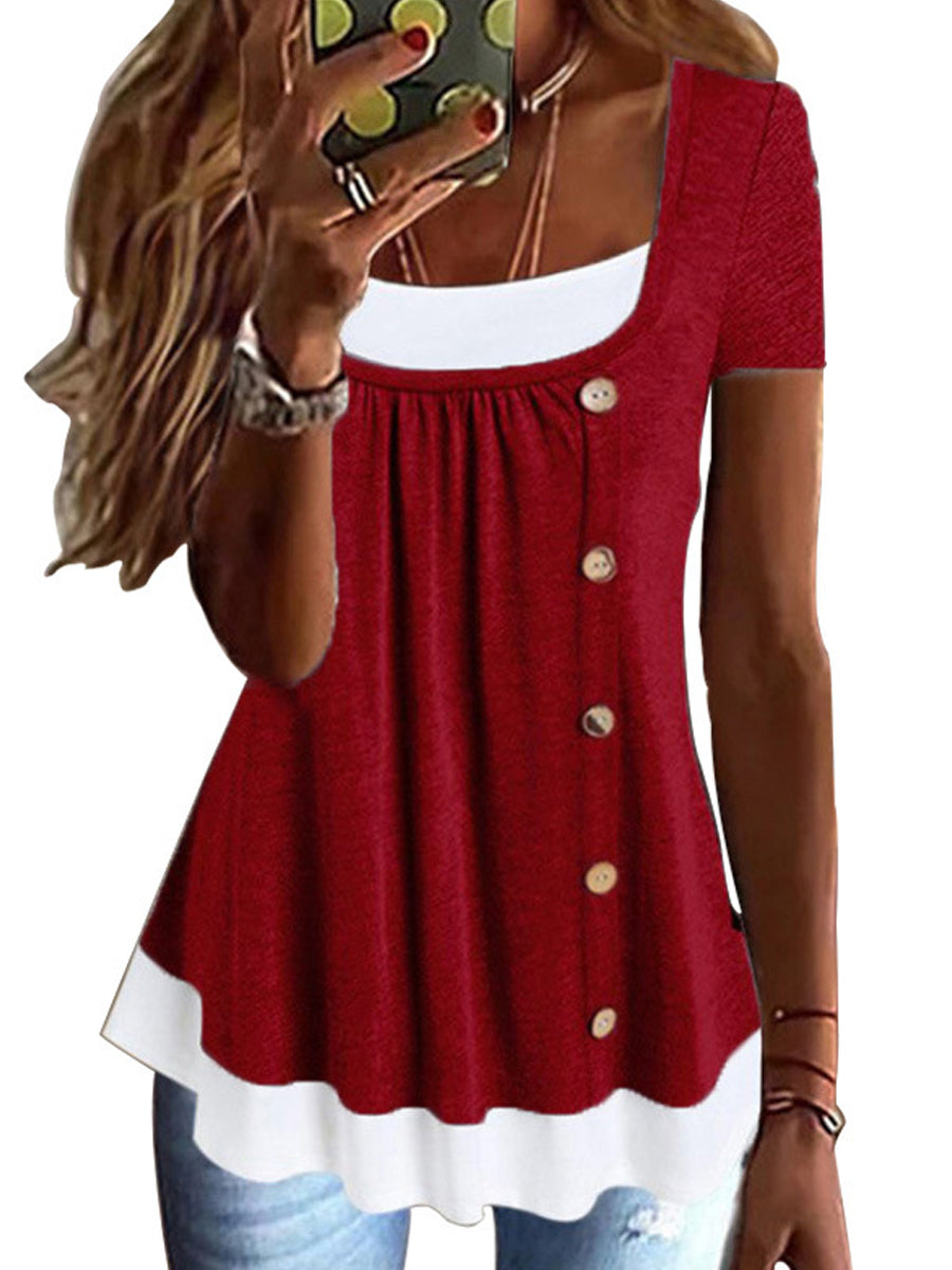 Upgrade your wardrobe with the Solid Color Pleated Button Short Sleeved T-Shirt, designed for women who seek a blend of style and comfort. This versatile top features: