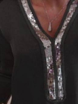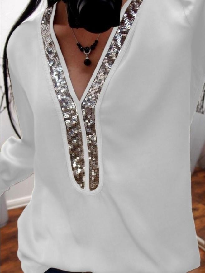 Solid Stitching V-neck Sequin Long-sleeved T-shirt
