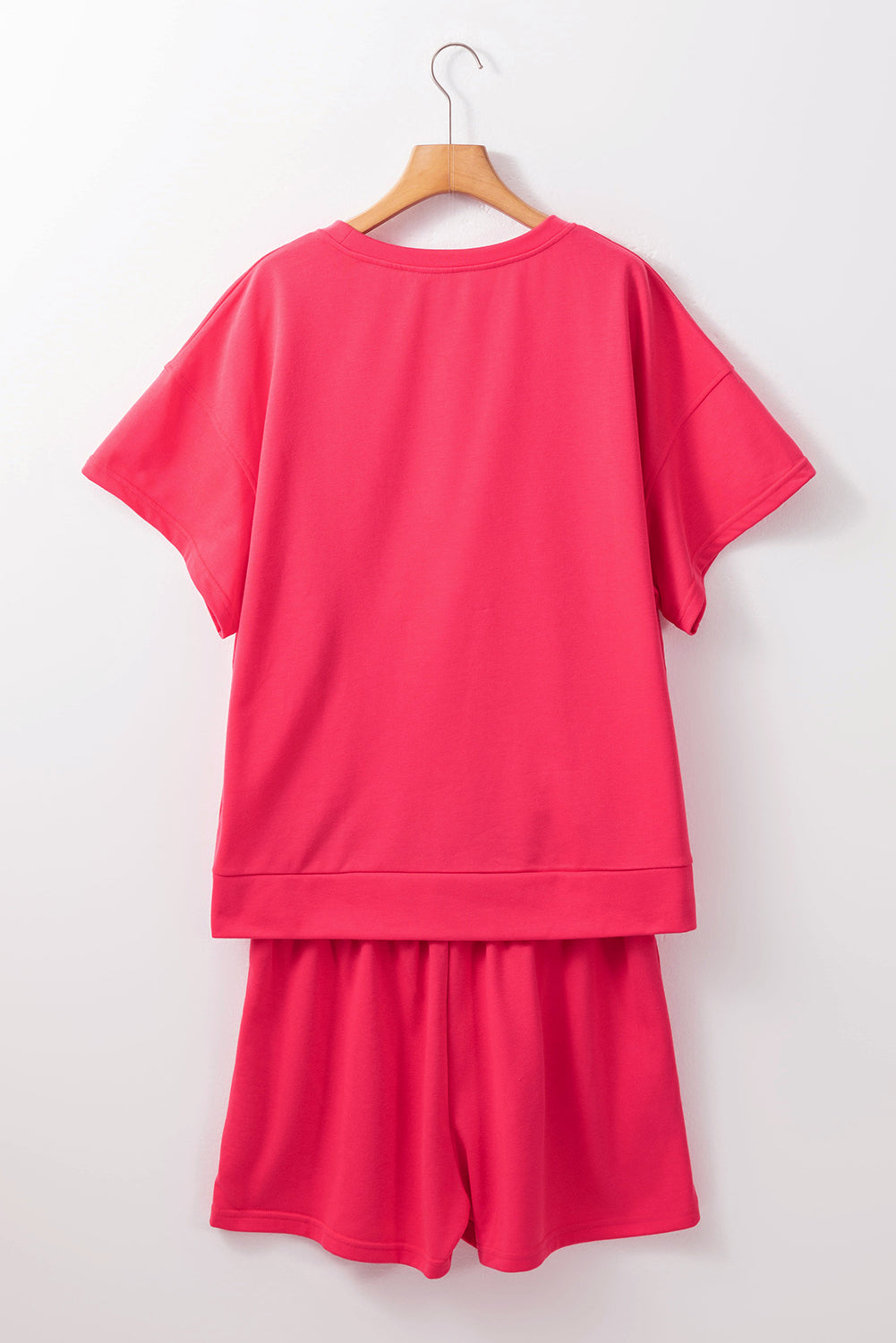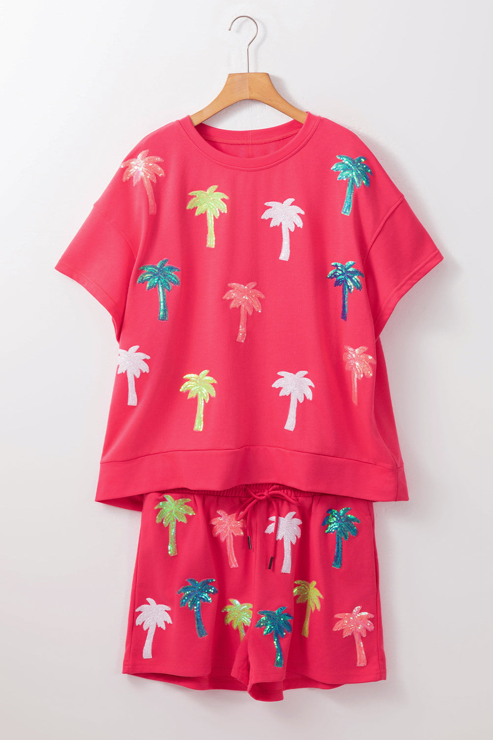 Strawberry Pink Two Piece Sequin Palm Trees Summer Short Set