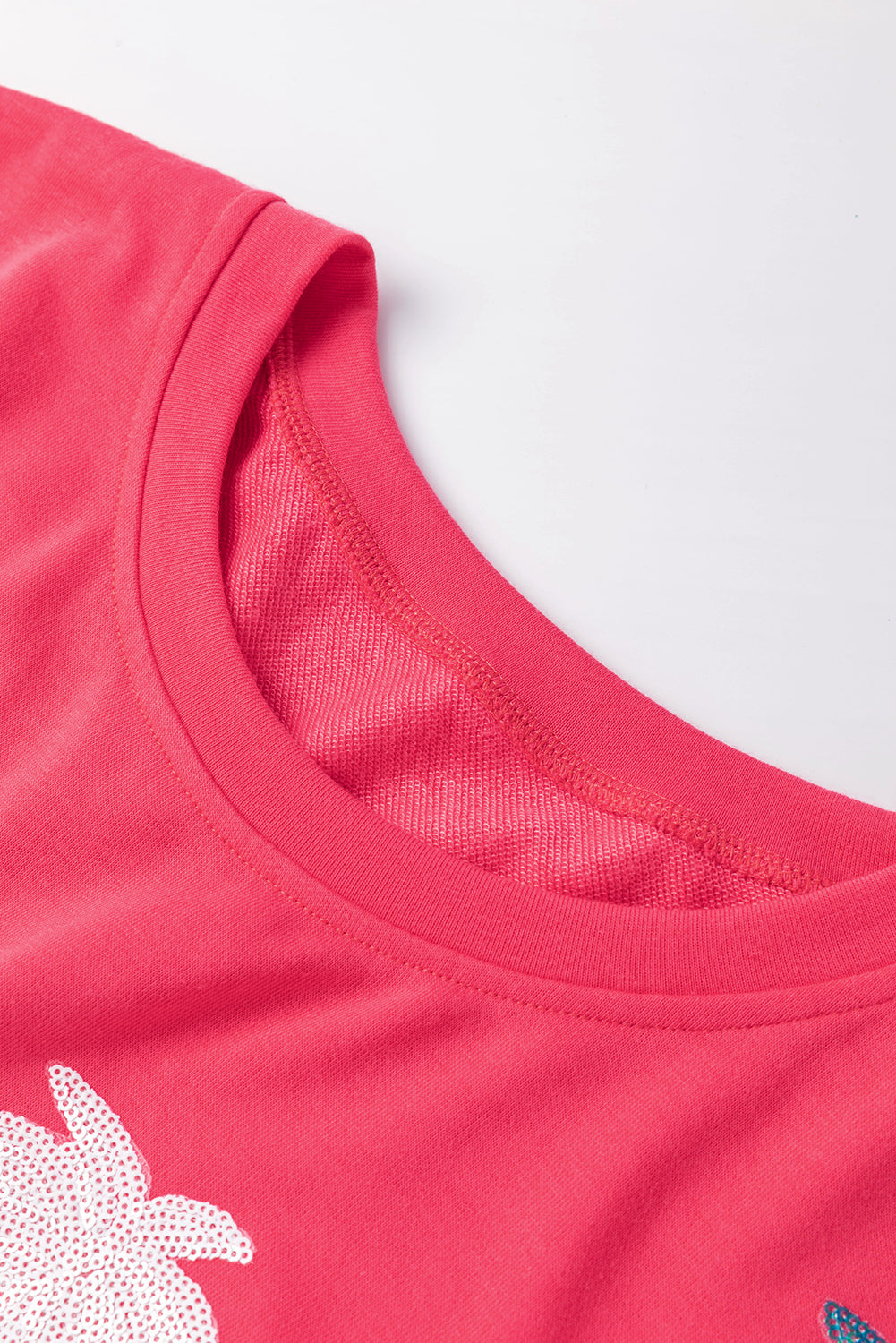 Unleash your summer style with our Strawberry Pink Two Piece Sequin Palm Trees Summer Short Set. This chic and casual ensemble is perfect for warm days, combining comfort and flair effortlessly.