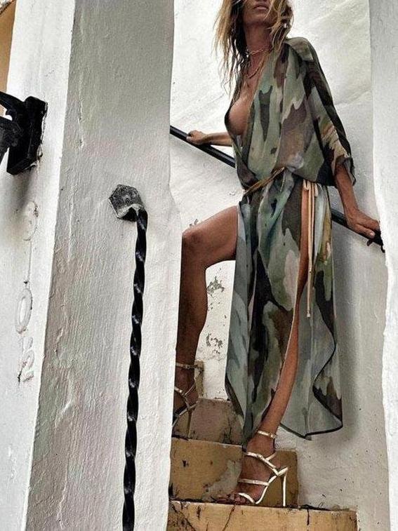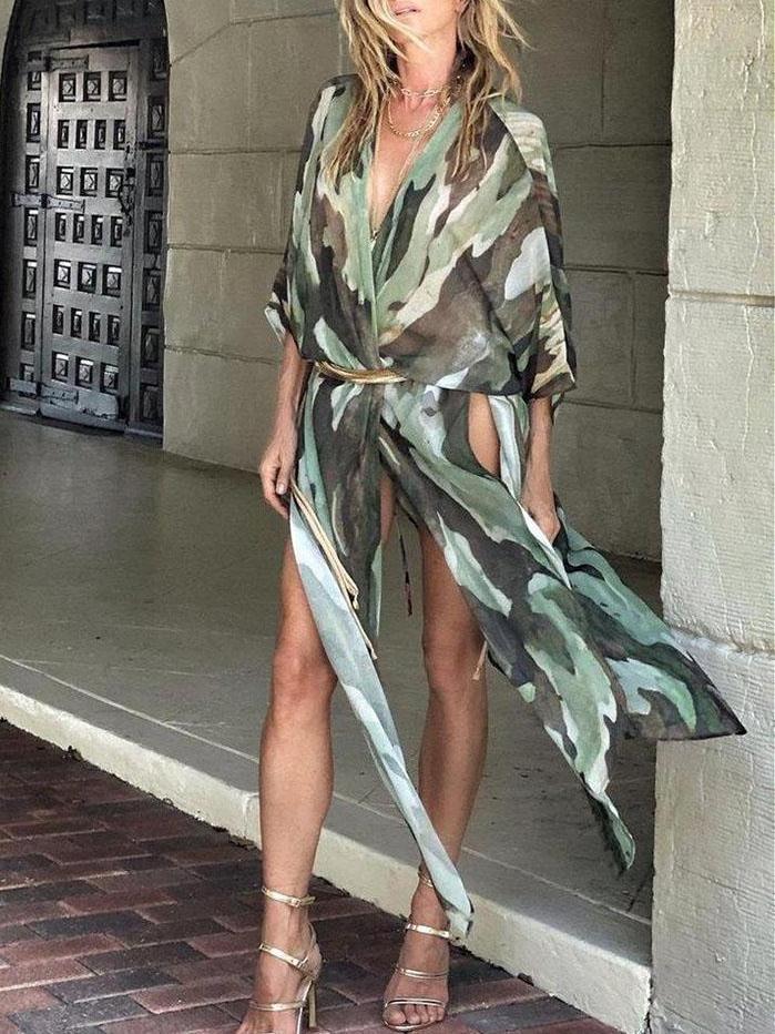 Summer Camo Print Deep V Neck Split Hem Outfit for Women