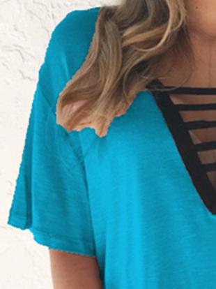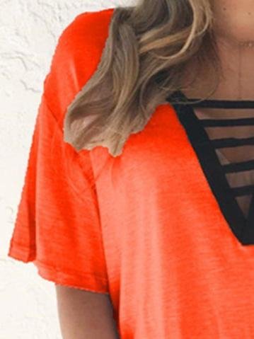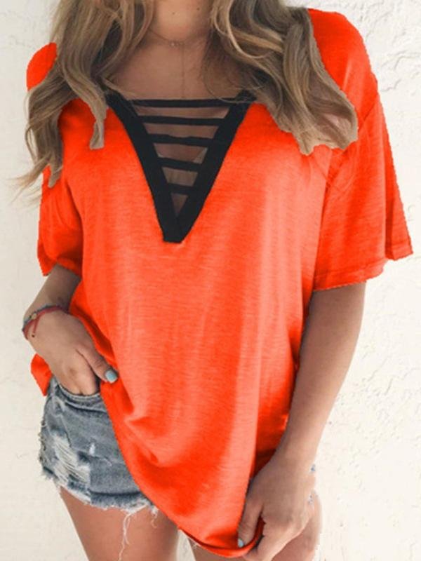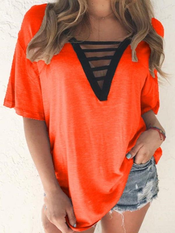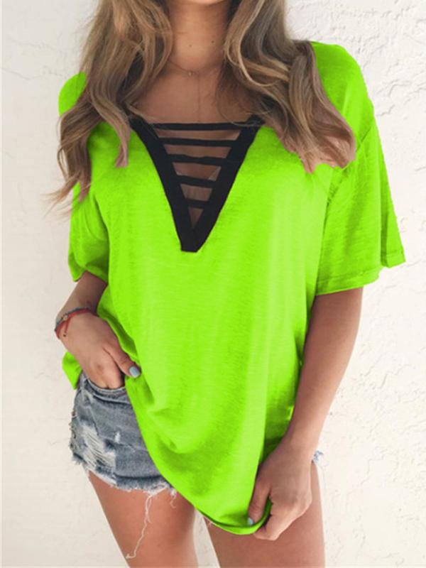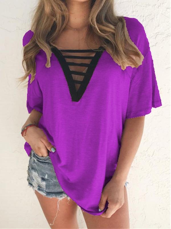 - Feature: V-neck, Short-sleeved, Solid, Cut Out