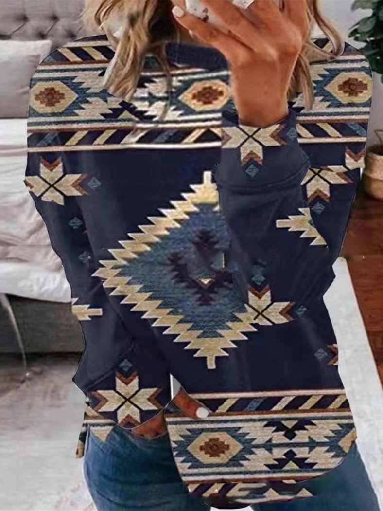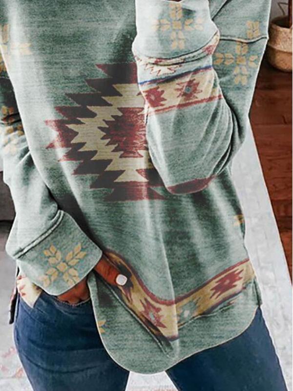 T-Shirts Retro Print Round Neck Long Sleeve T-Shirt for Women