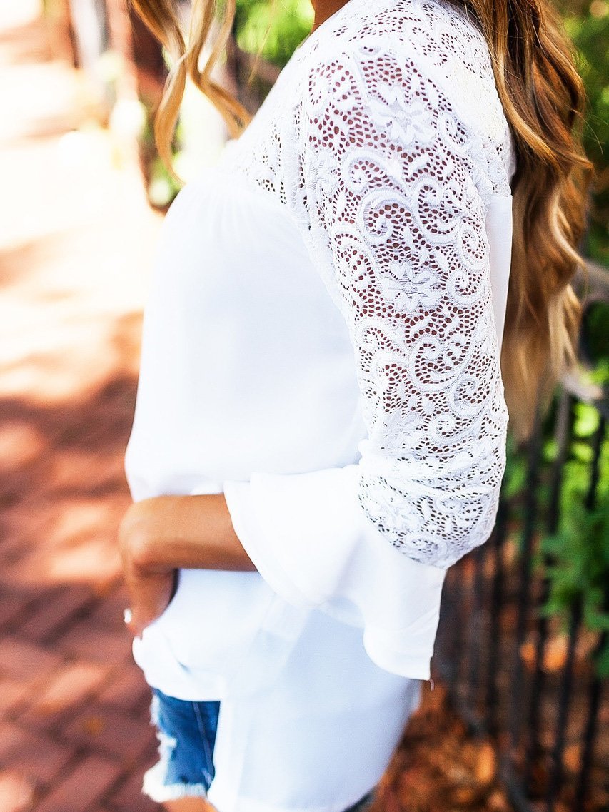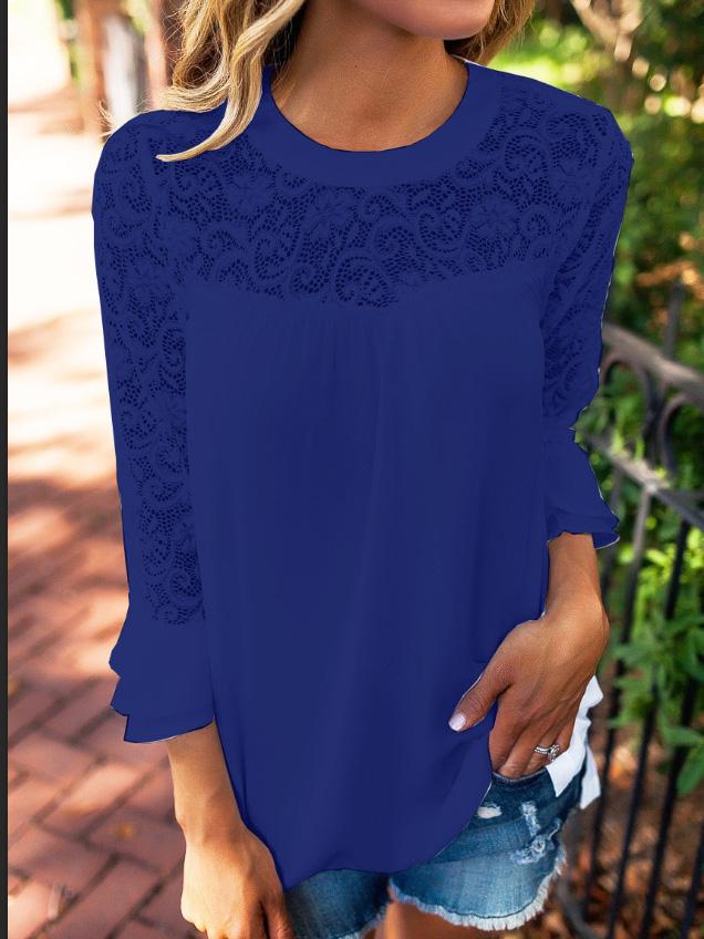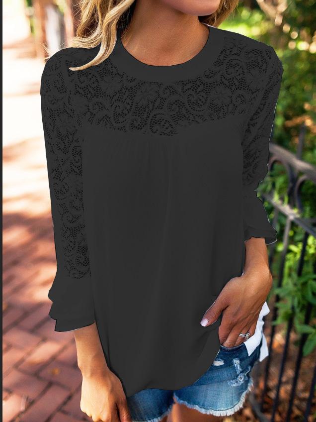 T-Shirts Round Neck Lace Stitching Long Sleeve T-Shirt for Women