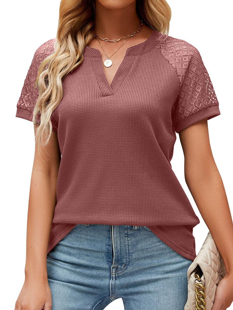 T-Shirts Solid Color Lace Hollow V-Neck Ruffle Sleeve Casual T-Shirt for Women