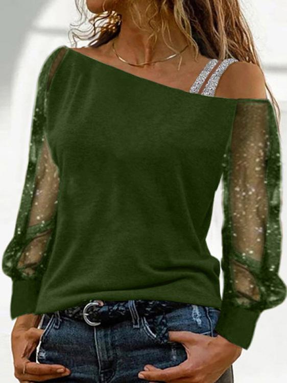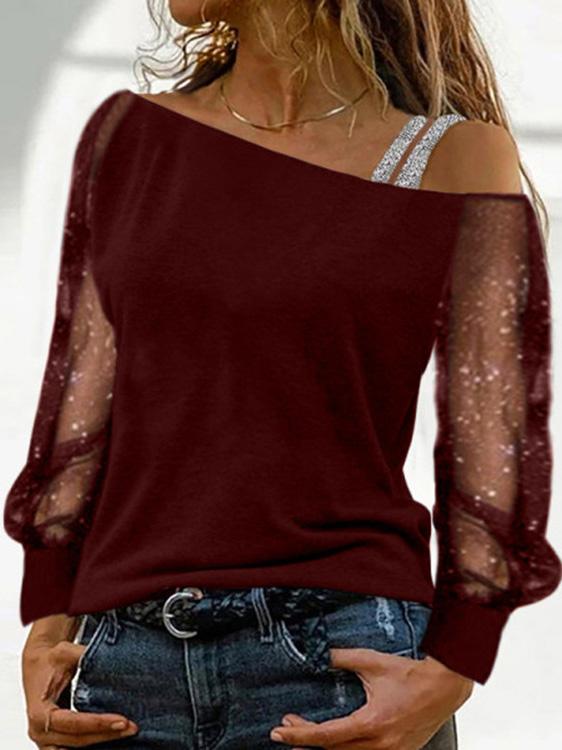 T-Shirts Sparkling Mesh Stitching Strapless Long Sleeve T-Shirt for Women