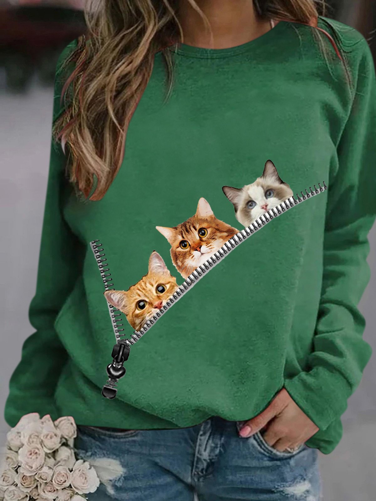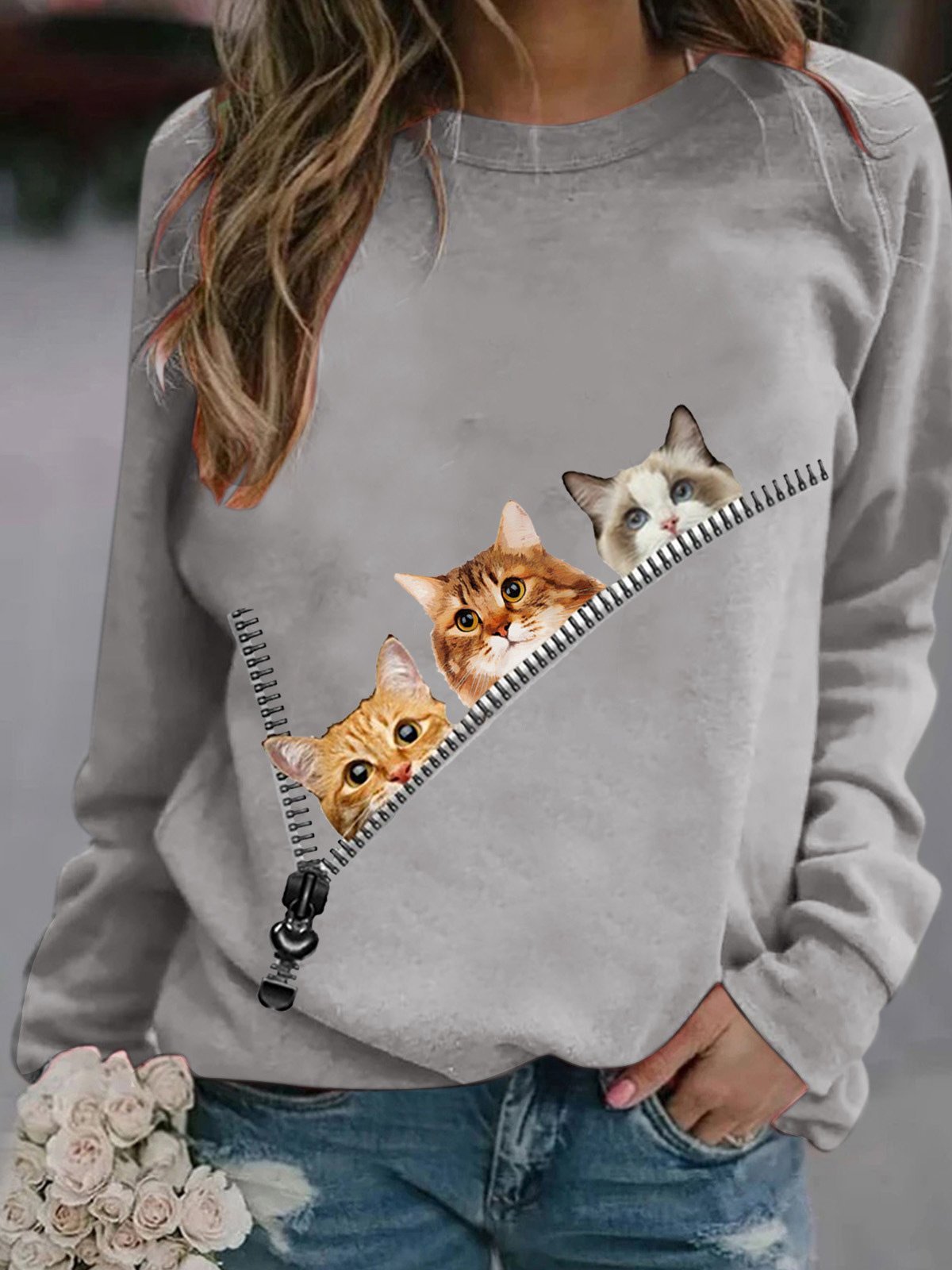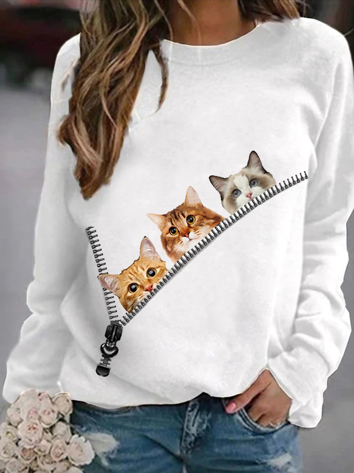 - Feature: Zip Cat Print, Round Neck, Long Sleeve