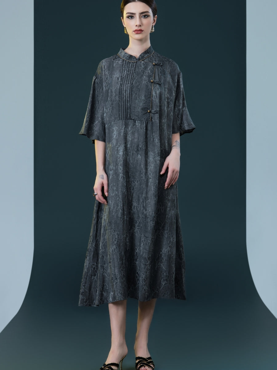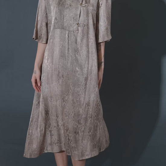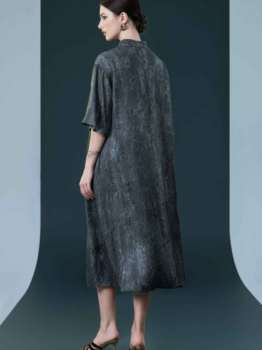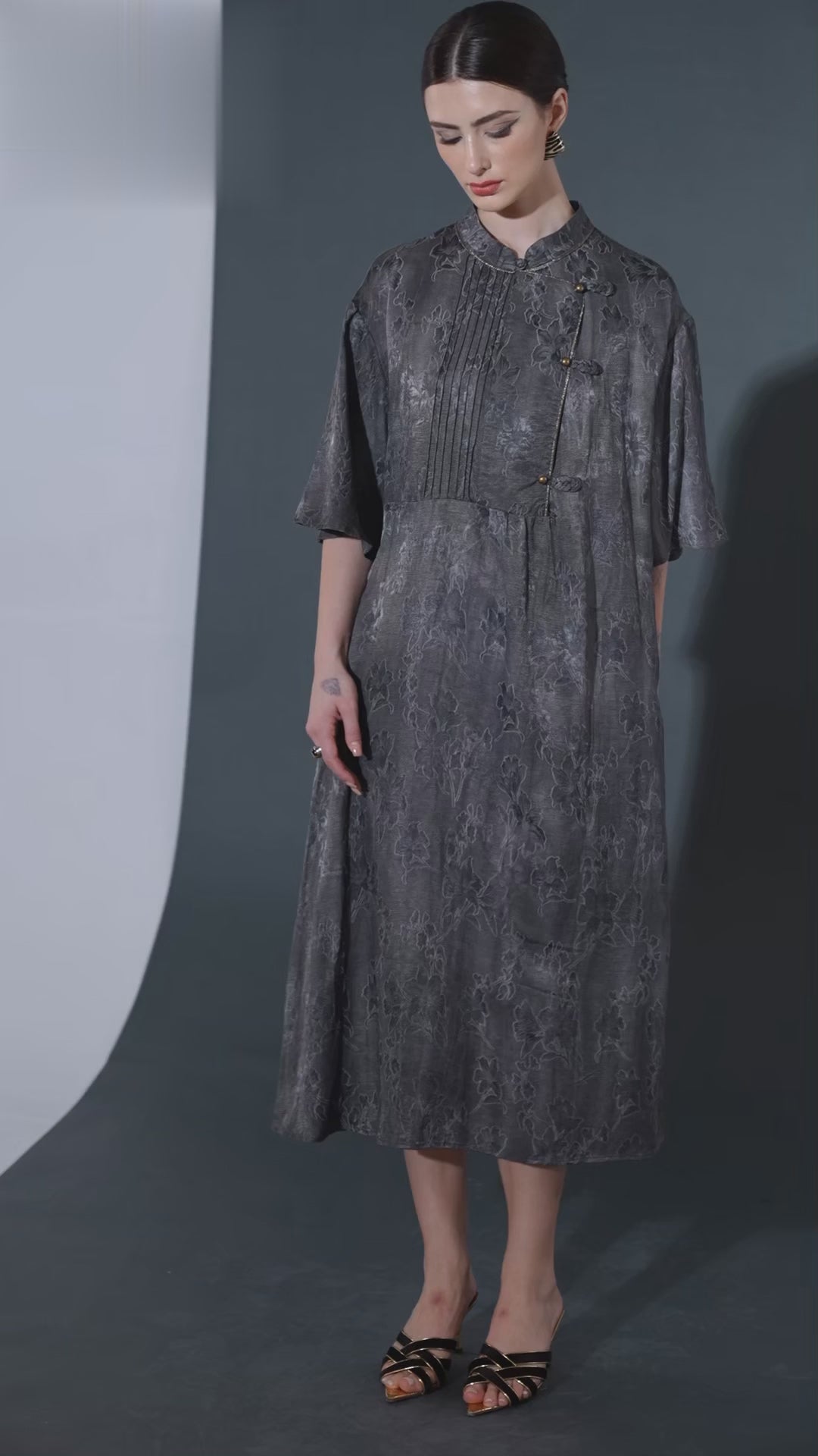 Step into timeless elegance with this taupe high-neck embroidered midi dress. Featuring intricate embroidery and a refined high-neck design with decorative buttons, this dress combines traditional charm with contemporary style. The soft, flowing fabric and relaxed fit ensure comfort, making it perfect for both casual and formal occasions. Pair with classic accessories and heels for a sophisticated look.