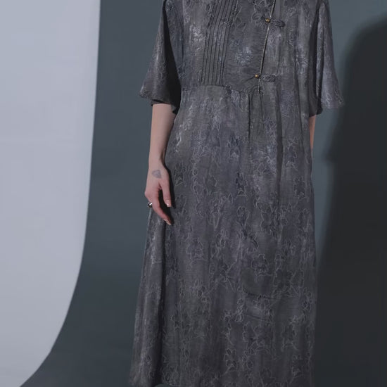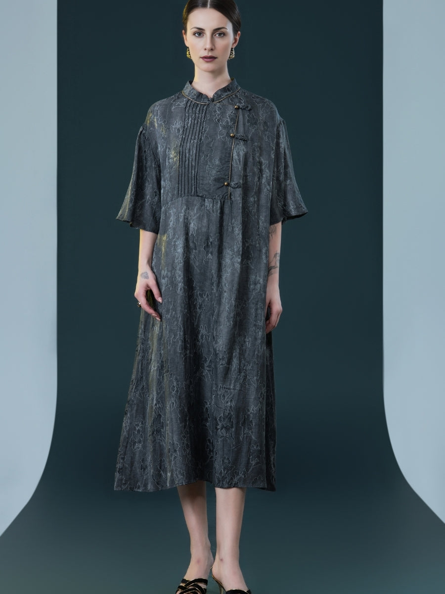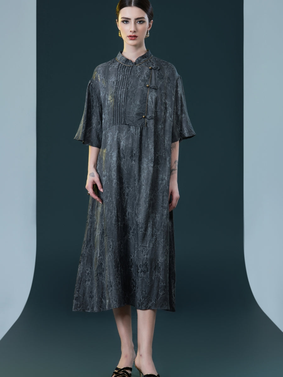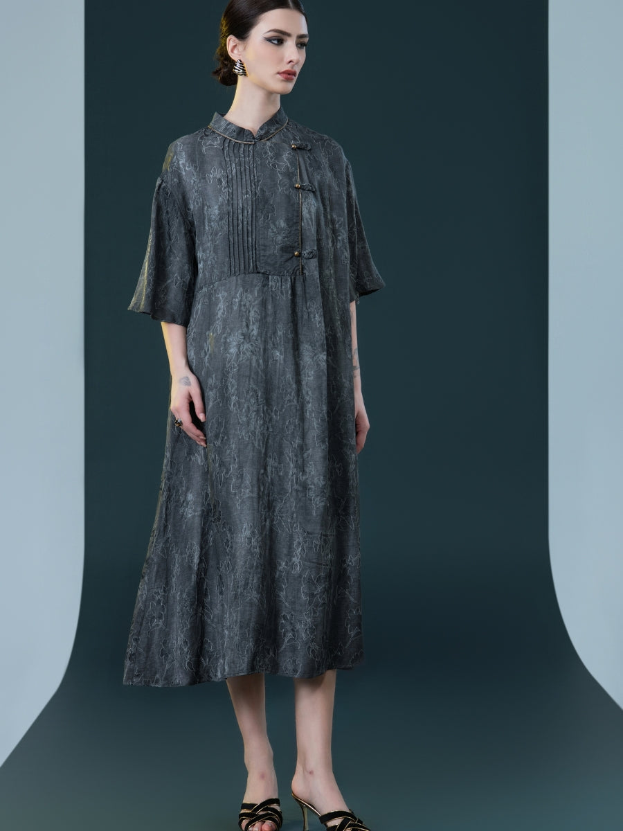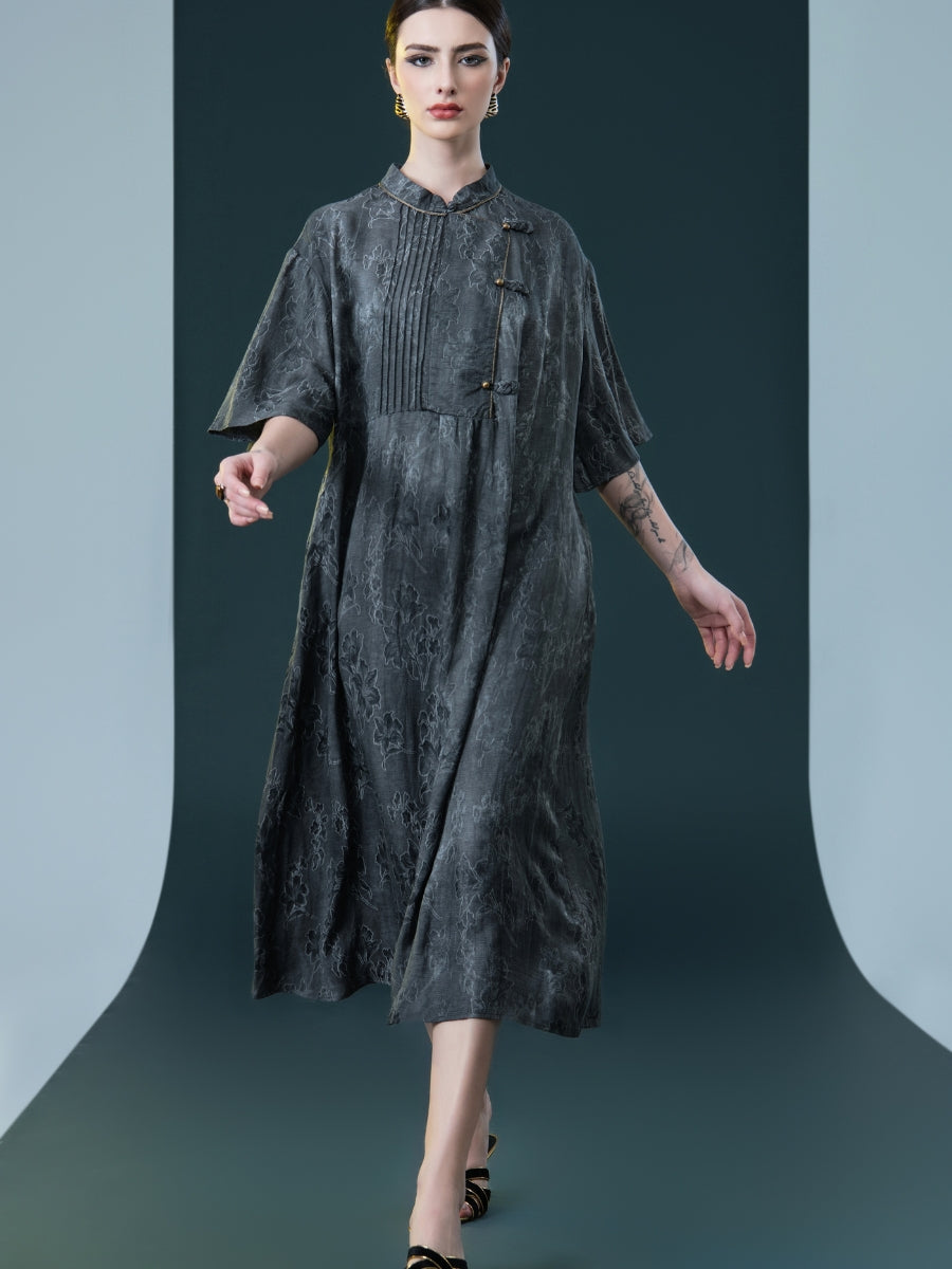 Step into timeless elegance with this taupe high-neck embroidered midi dress. Featuring intricate embroidery and a refined high-neck design with decorative buttons, this dress combines traditional charm with contemporary style. The soft, flowing fabric and relaxed fit ensure comfort, making it perfect for both casual and formal occasions. Pair with classic accessories and heels for a sophisticated look.