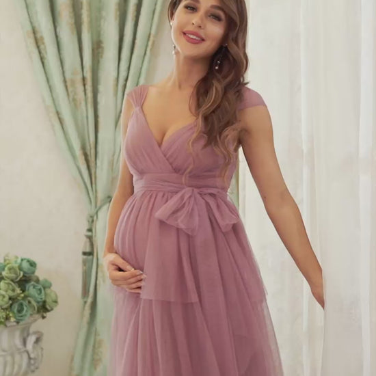 Elegant V-Neck Maternity Dress with Tie Waist and Tiered Floor-Length Styling