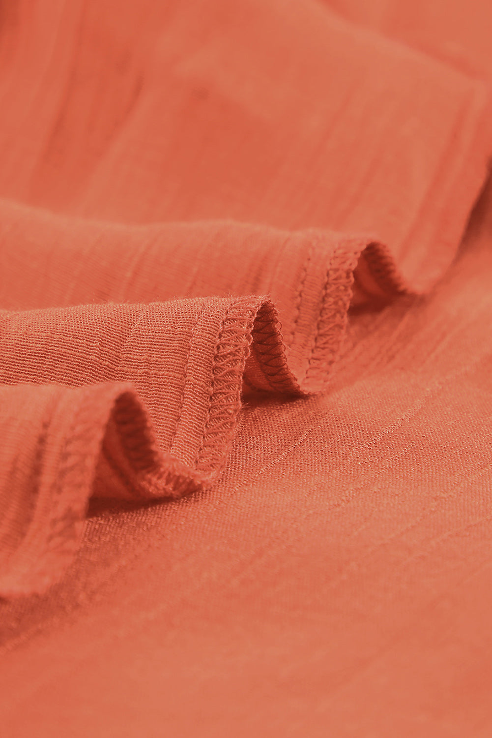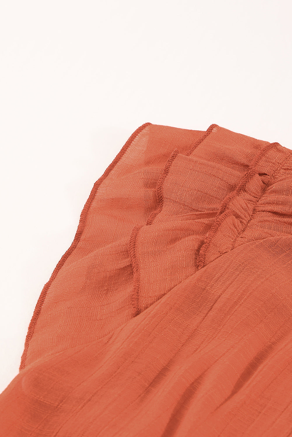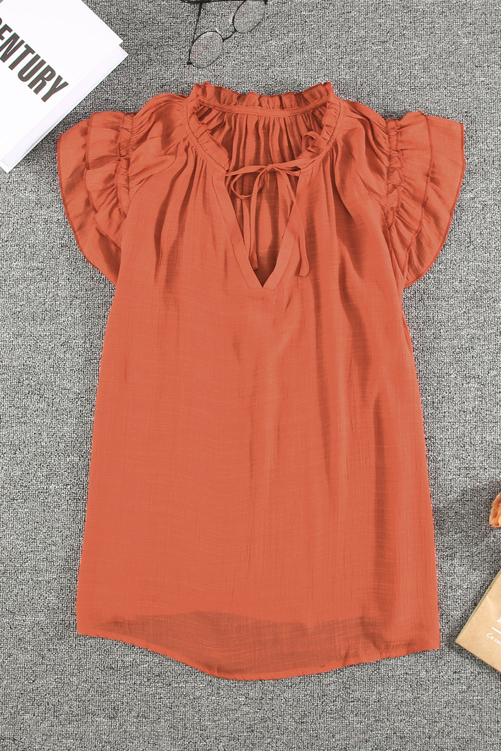 The tiered ruffled design of this top is elegant, trendy, and eye-catching. The V neck accentuates the wearer's neck and shoulder line, adding a touch of sophistication. Made from soft and high-quality materials, this top is lightweight and breathable, ensuring comfort all day long. The short sleeve design pairs perfectly with a bandeau bralette for a stylish look.