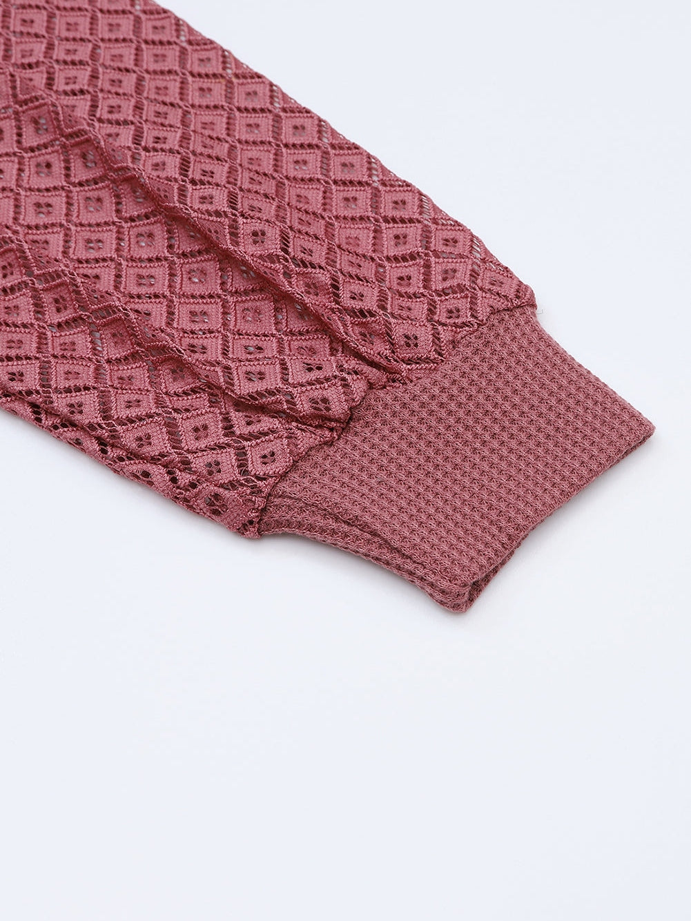 Lacy Waffle Knit Button-Up Cardigan with Long Sleeves