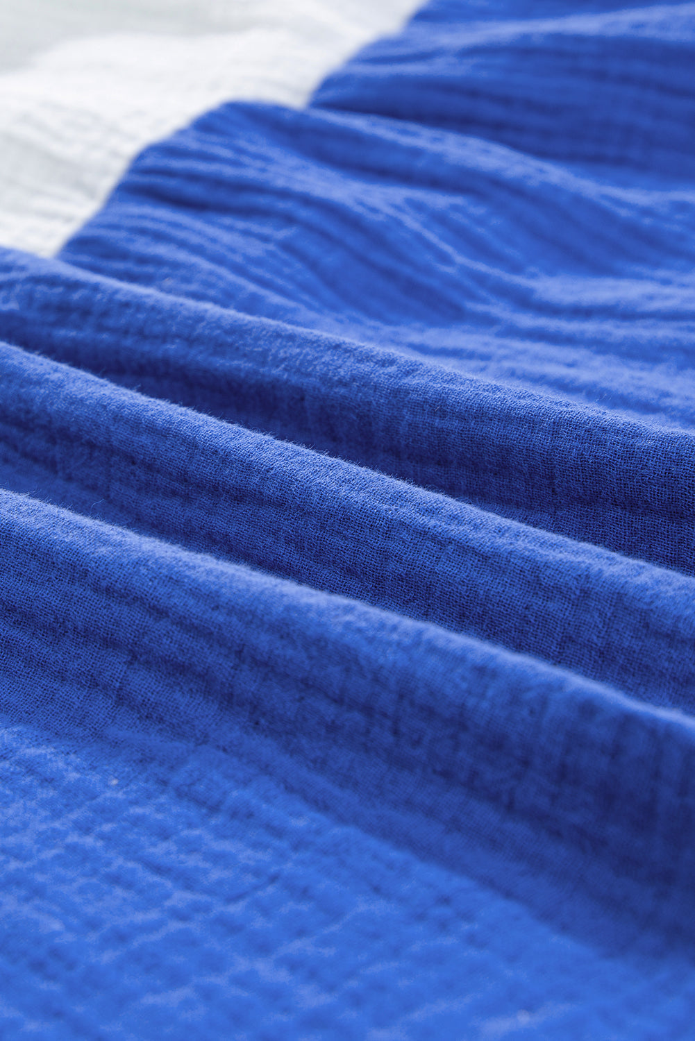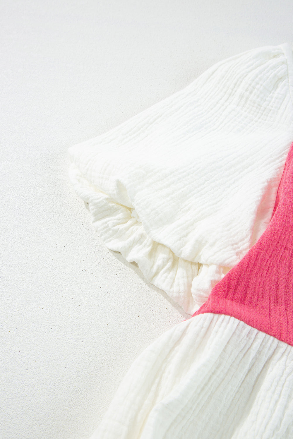 Step into summer with a playful and chic vibe in our White Crinkle Colorblock Puff Sleeve Buttons Babydoll Dress. This delightful mini dress combines comfort and style effortlessly, making it an essential addition to your wardrobe.