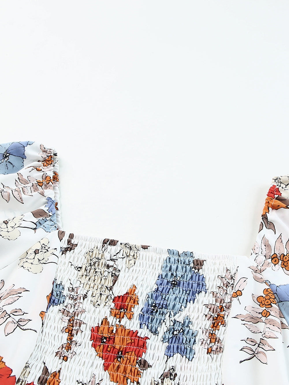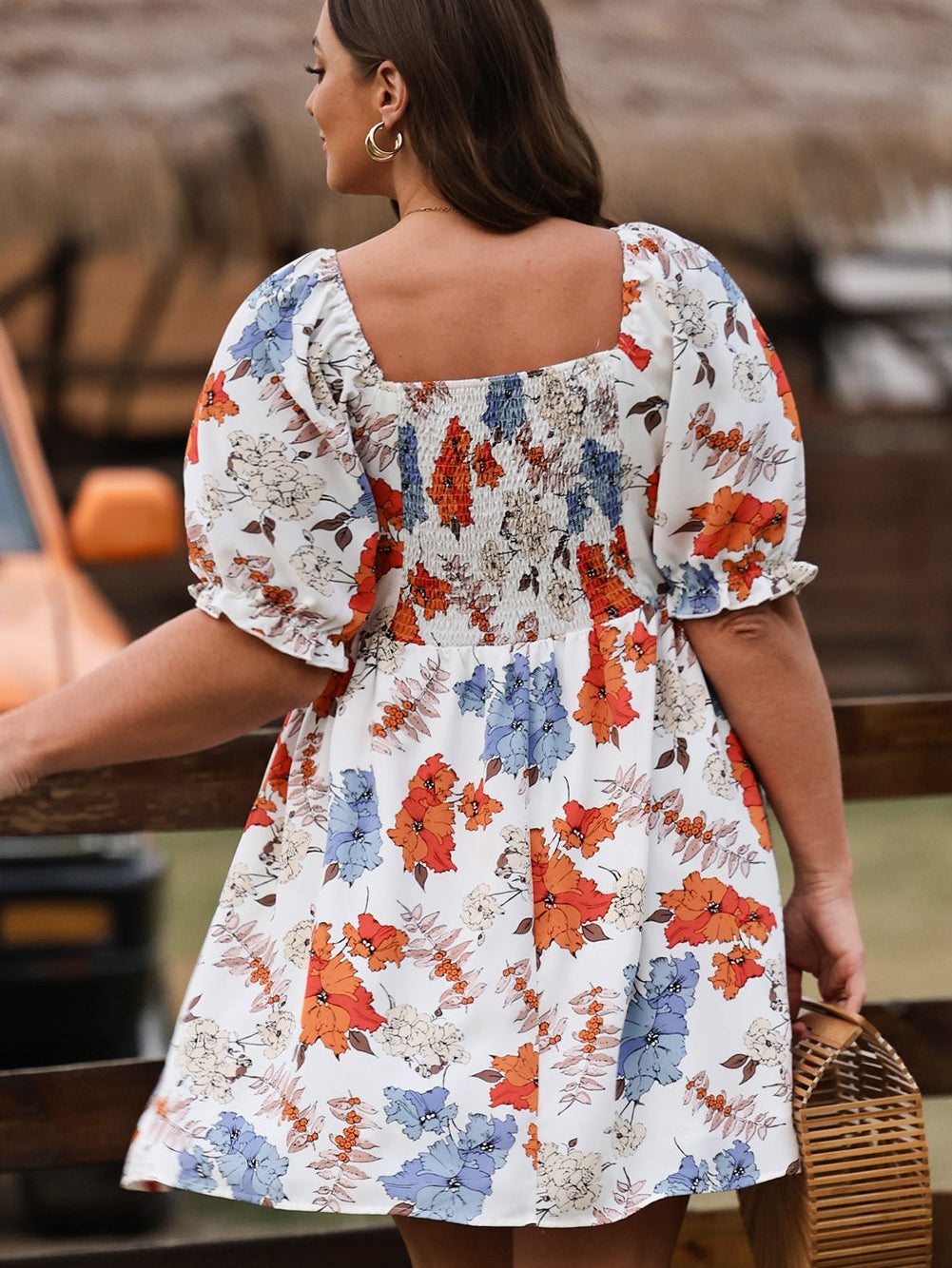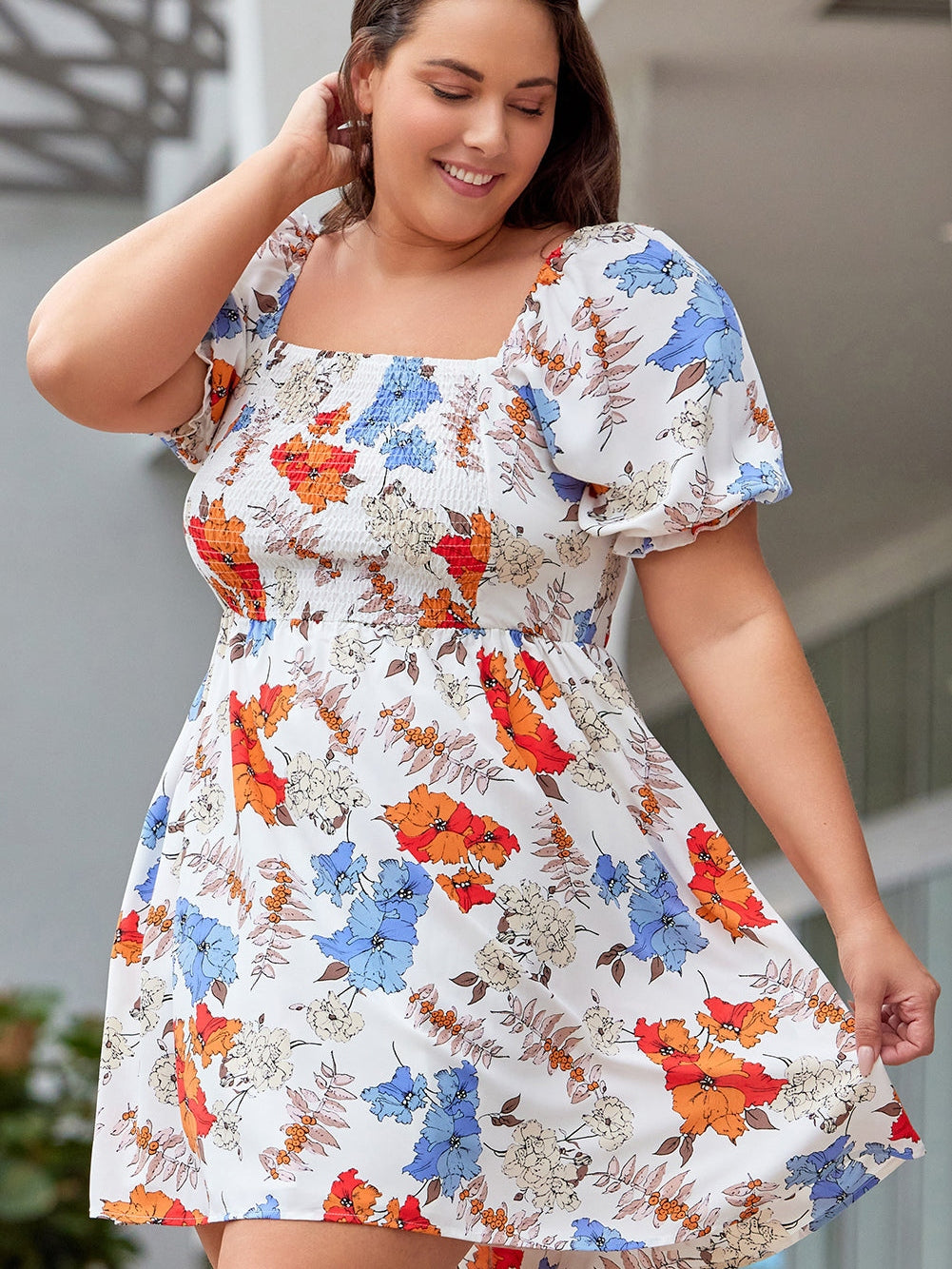 Enhance your style with this stunning White Floral Smocked Flared Plus Size Dress. Embrace the beauty of this dress that seamlessly combines elegance and comfort.