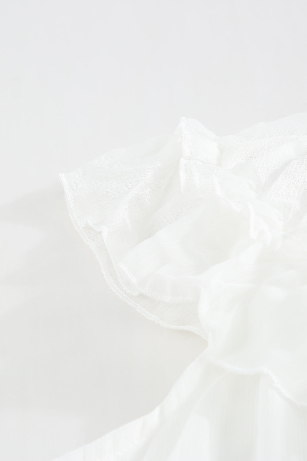 The White Frilled Detail Tulle Tank Top is ultra-femme and elegant in a solid color hue. Crafted from softly textured chiffon, it features an elastic neckline, ruffled chest, and a flowy relaxed fit. This tank top offers a dainty look that can be paired with distressed denim and heels for a chic date night outfit. The chiffon fabric provides a cozy, breathable, and graceful feel, making it suitable for daily wear, work, and holiday occasions.