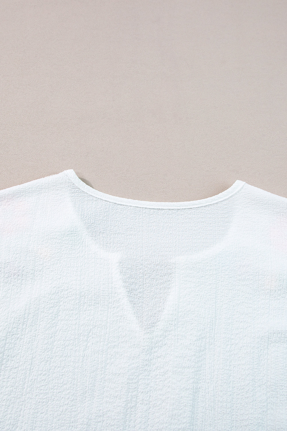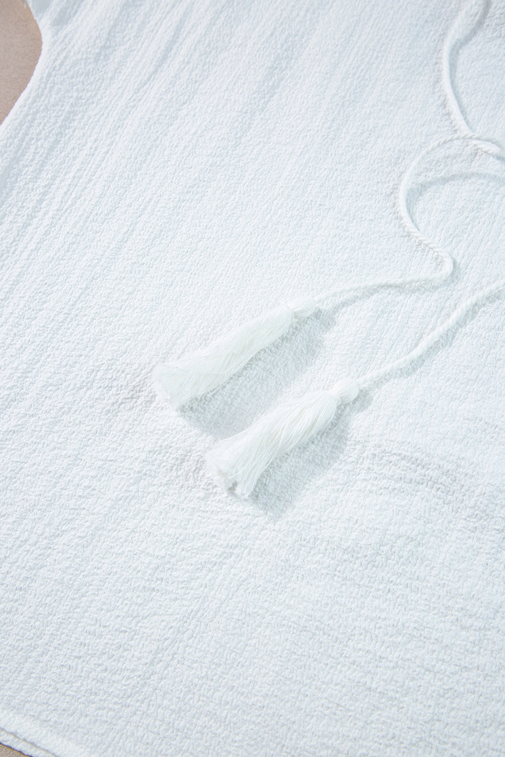 Step into summer with unparalleled style and comfort in our White Knit Crochet Patchwork Textured Fringed V Neck Blouse. This piece is perfect for vacationing or daily outings, effortlessly blending a relaxed bohemian vibe with contemporary design.