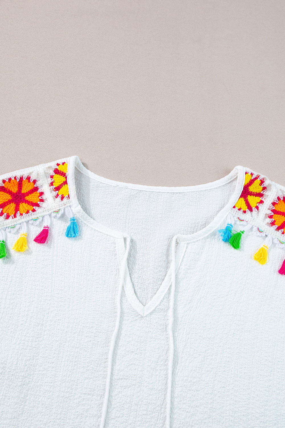 Elevate Your Wardrobe with Our White Knit Crochet Patchwork Textured Fringed V Neck Blouse