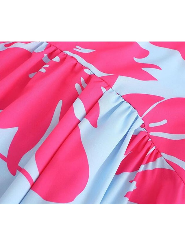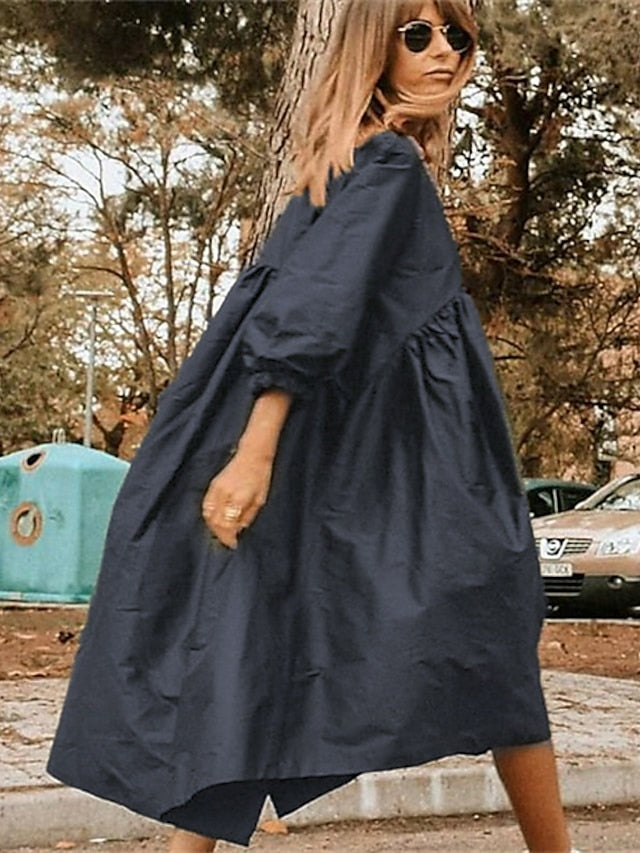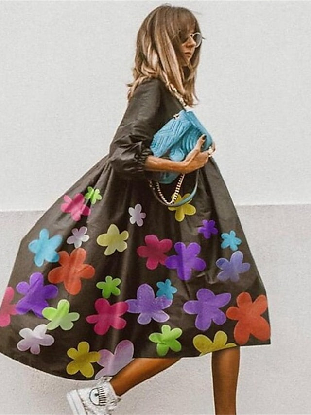 - Loose fit style for comfortable wear- Stylish lantern sleeves and crew neck design- Flattering A-line silhouette and knee-length cut- Eye-catching pattern adds a pop of color- Versatile tunic dress suitable for spring, summer, and fall- Perfect for a relaxing vacation or any casual outing- Unique hem with a shorter front and longer back adds a trendy element- Midi dress length for a chic and feminine look - Available in women's sizing, please refer to our size chart for best fit.